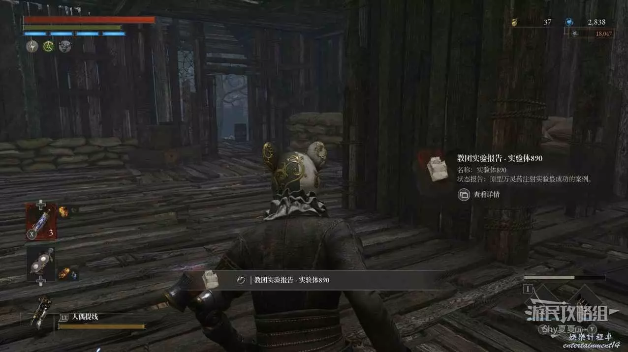 小木屋內可以獲得【收藏品-檔-教團實驗報告-實驗體890】,另一邊可以拾取【新月月光石】,全部拾取後,跳下梯子,迎戰一個BOSS。