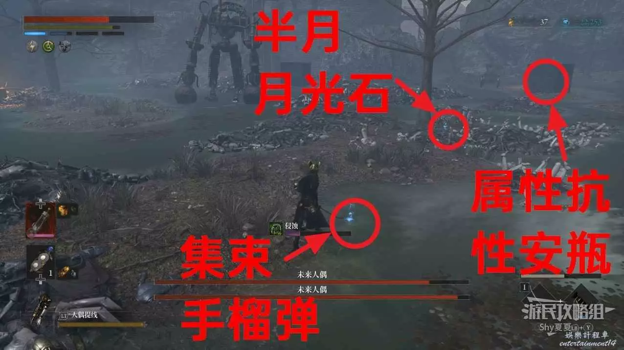 一個較高的人偶屍體堆上可以拾取【半月月光石】。