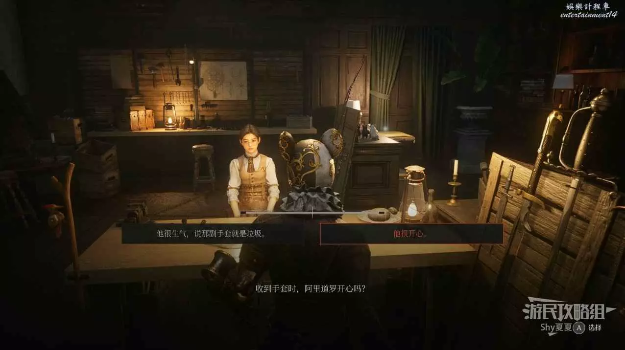 找到歐也妮對話,說換選擇【他很開心】,真話選擇【他很生氣,說那副手套就是垃圾】。