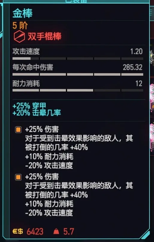 不選單手電筒警棍是因為電警棍需要1秒的充能時間,我們選擇近戰商店售賣的橙色5階雙手棍棒。第一次打開購買頁面時,武器都是單孔,此時我們選擇之前版本刷詞條的方法,存檔——讀檔,之後會發現武器變成了雙孔,但有很大幾率會被藍色插件占位,插件無法拆卸,因此這裡需要多次S/L+跳轉24小時,直到刷出雙白孔的武器。