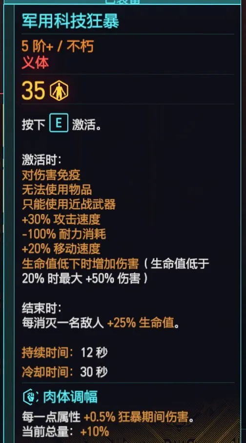 義體選擇軍科狂暴5,cd短,且傷害加的多,狂暴時間內是無敵狀態,而且狂暴結束後基本是回滿血的,期間我們靠著回血藥、各式各樣的回血buff、減傷buff、閃光雷、砸地控、擊暈控,足夠讓我們V撐得過cd期。