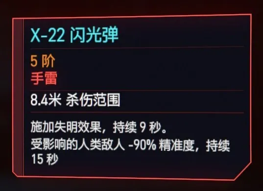 手雷選擇閃光雷,可以讓敵方9秒之內失明,並且減少90%準確度,持續15秒,大大提升了我們的生存空間。而且閃光雷的爆炸範圍比普通手雷大一倍,更容易疊上多層buff。