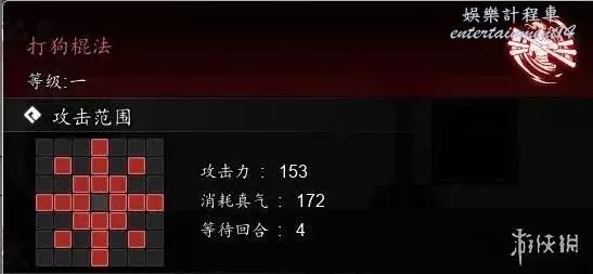 4級效果-棍打雙犬:每使用2次丐幫所有棍法招式後,本招式CD-1,下回合丐幫所有棍法招式傷害+15%。