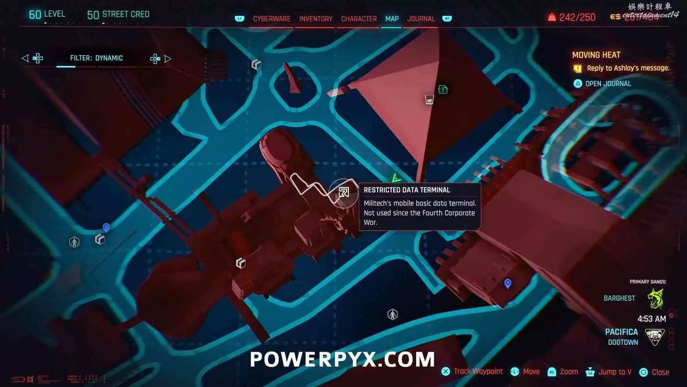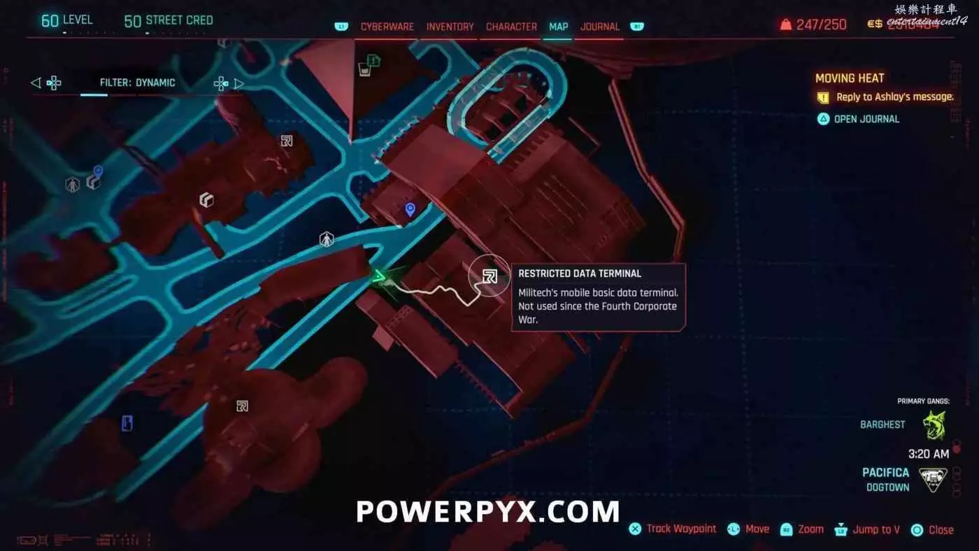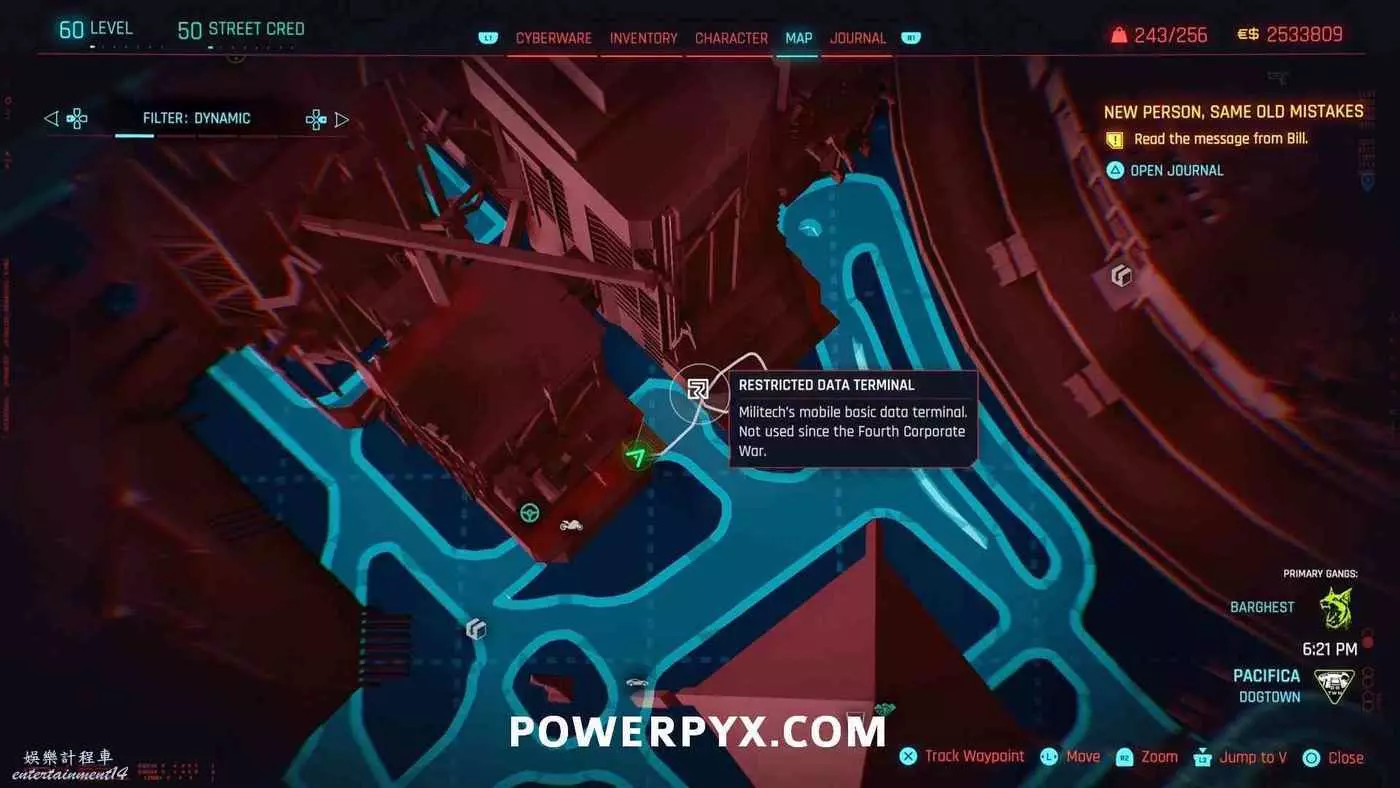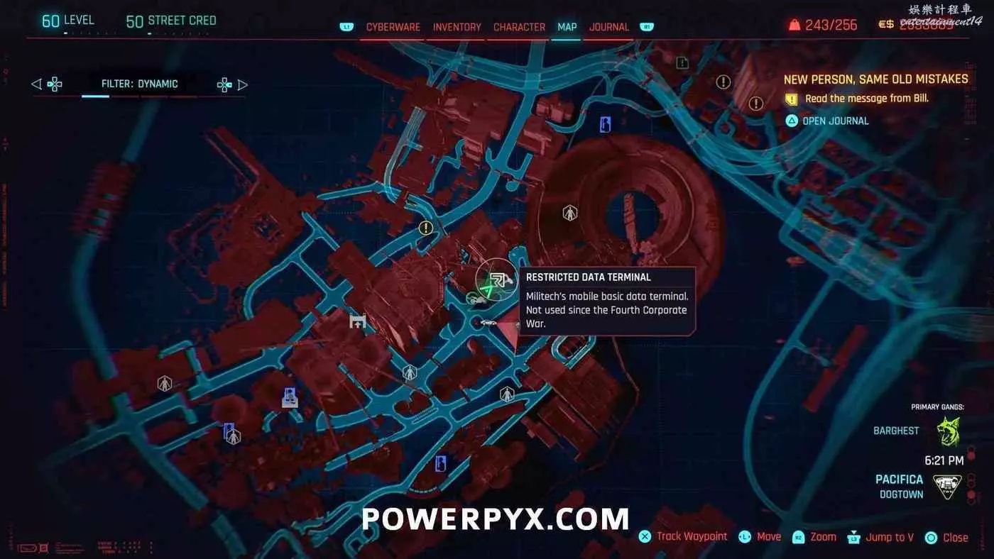 從克雷斯街傳送點往難走,找到【犯罪活動升級】標記(地圖上的綠色三骷髏圖示),進入敵人基地,穿過隧道進入一個敵人超級多的房間,軍用科技資料終端就在左側上鎖的房間內。肉體屬性夠的話可以強行開門,也可以通過該房間下層地板上的網格門,利用通風管道爬梯子進入該房間
