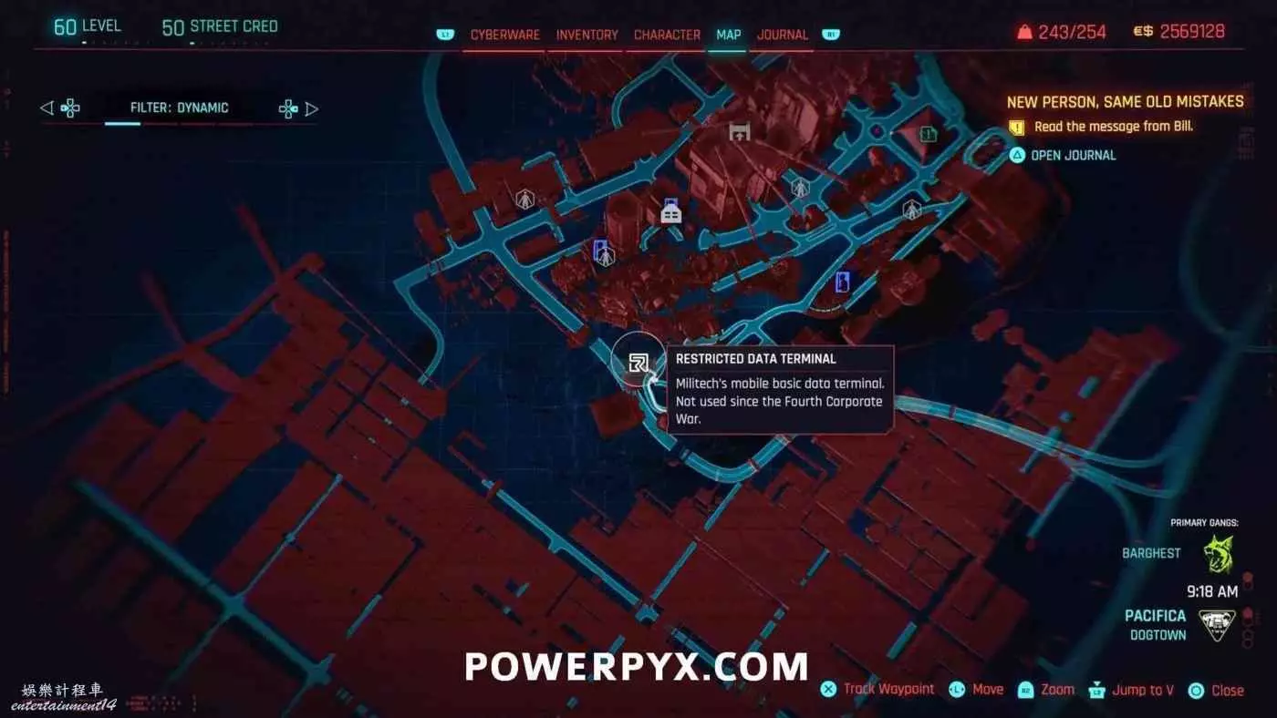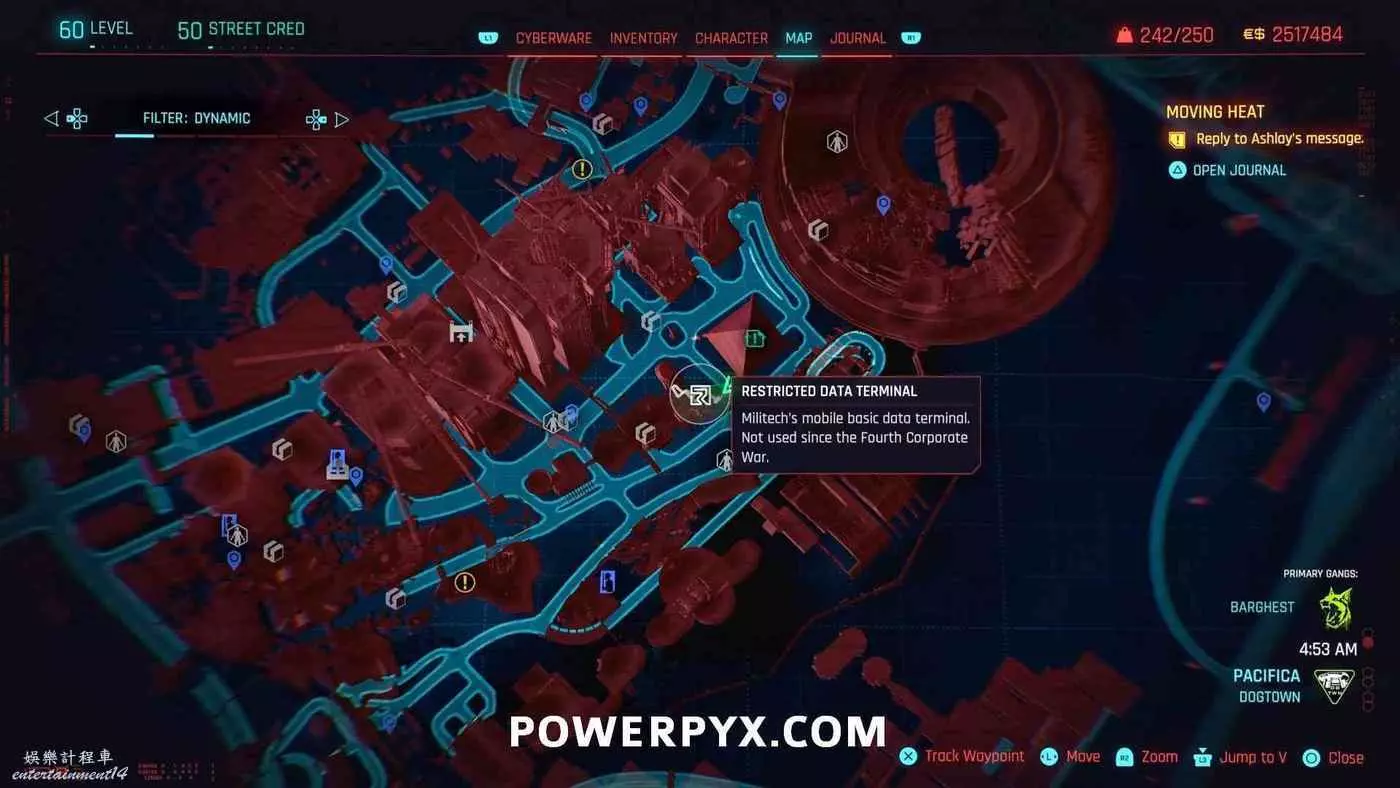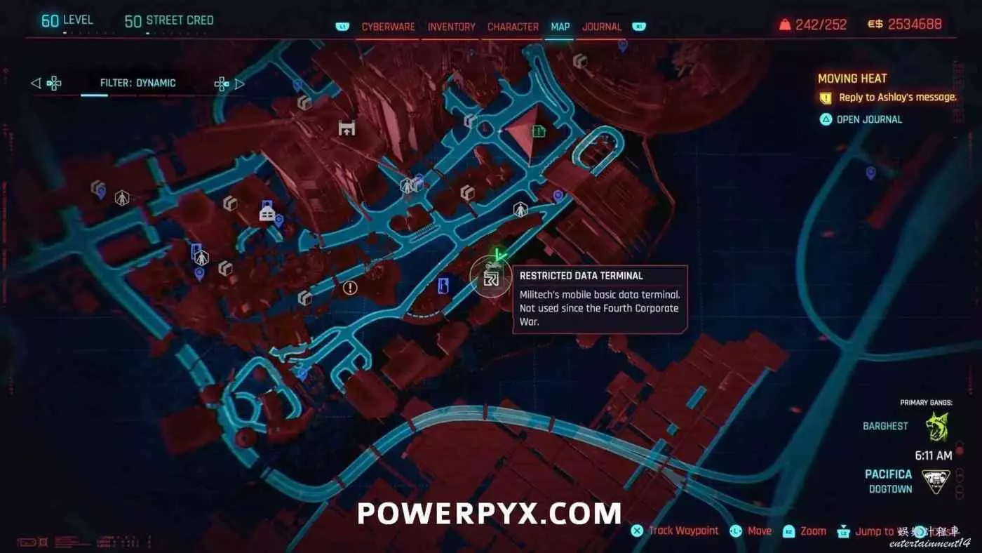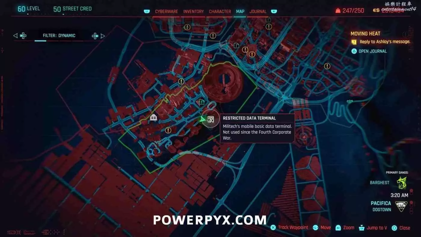 從克雷斯街傳送點往難走,找到【犯罪活動升級】標記(地圖上的綠色三骷髏圖示),進入敵人基地,穿過隧道進入一個敵人超級多的房間,軍用科技資料終端就在左側上鎖的房間內。肉體屬性夠的話可以強行開門,也可以通過該房間下層地板上的網格門,利用通風管道爬梯子進入該房間