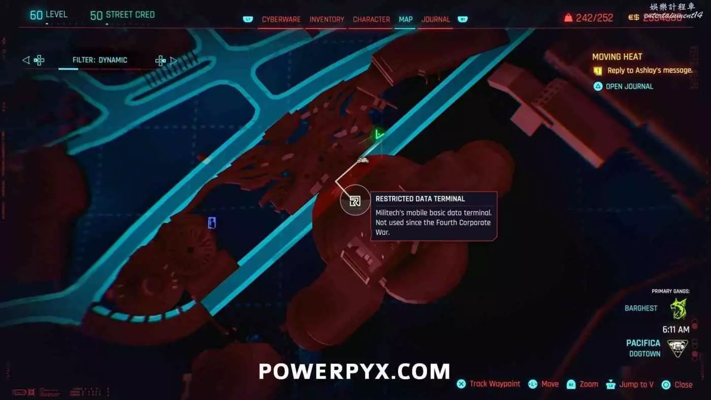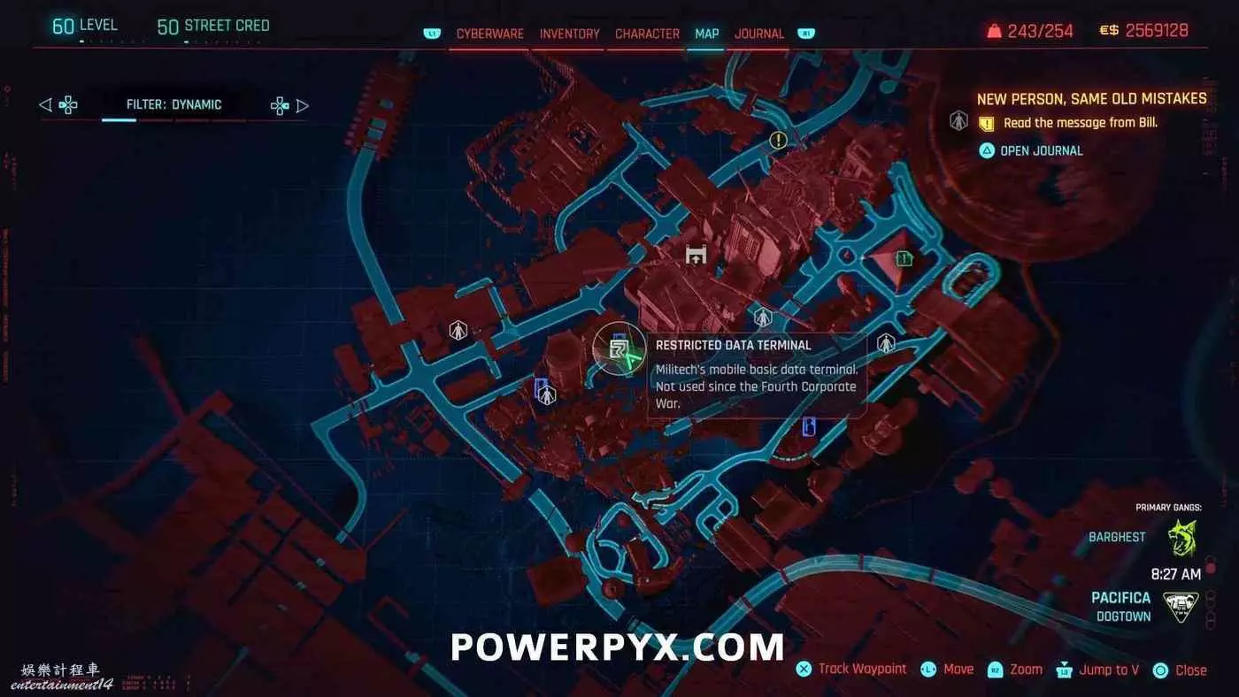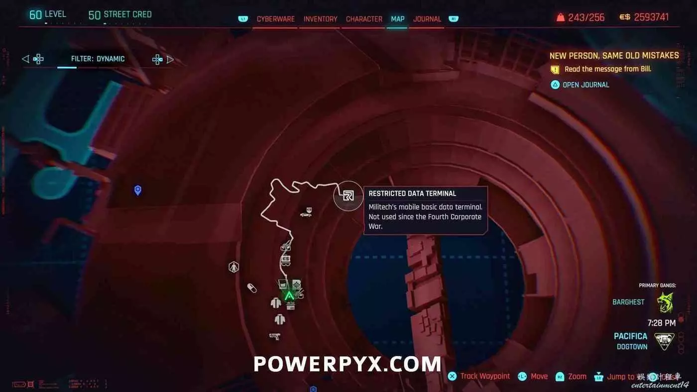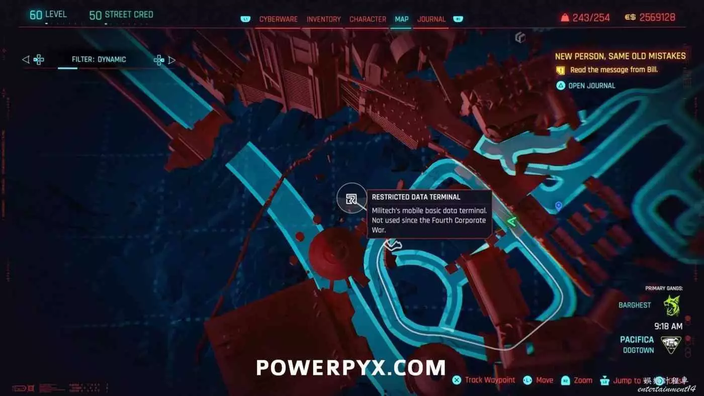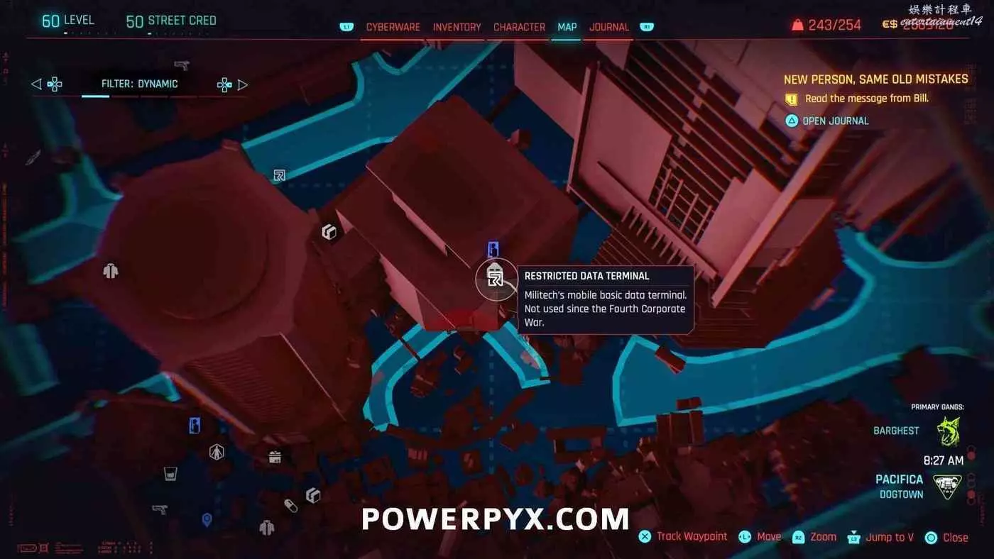 從克雷斯街傳送點往難走,找到【犯罪活動升級】標記(地圖上的綠色三骷髏圖示),進入敵人基地,穿過隧道進入一個敵人超級多的房間,軍用科技資料終端就在左側上鎖的房間內。肉體屬性夠的話可以強行開門,也可以通過該房間下層地板上的網格門,利用通風管道爬梯子進入該房間