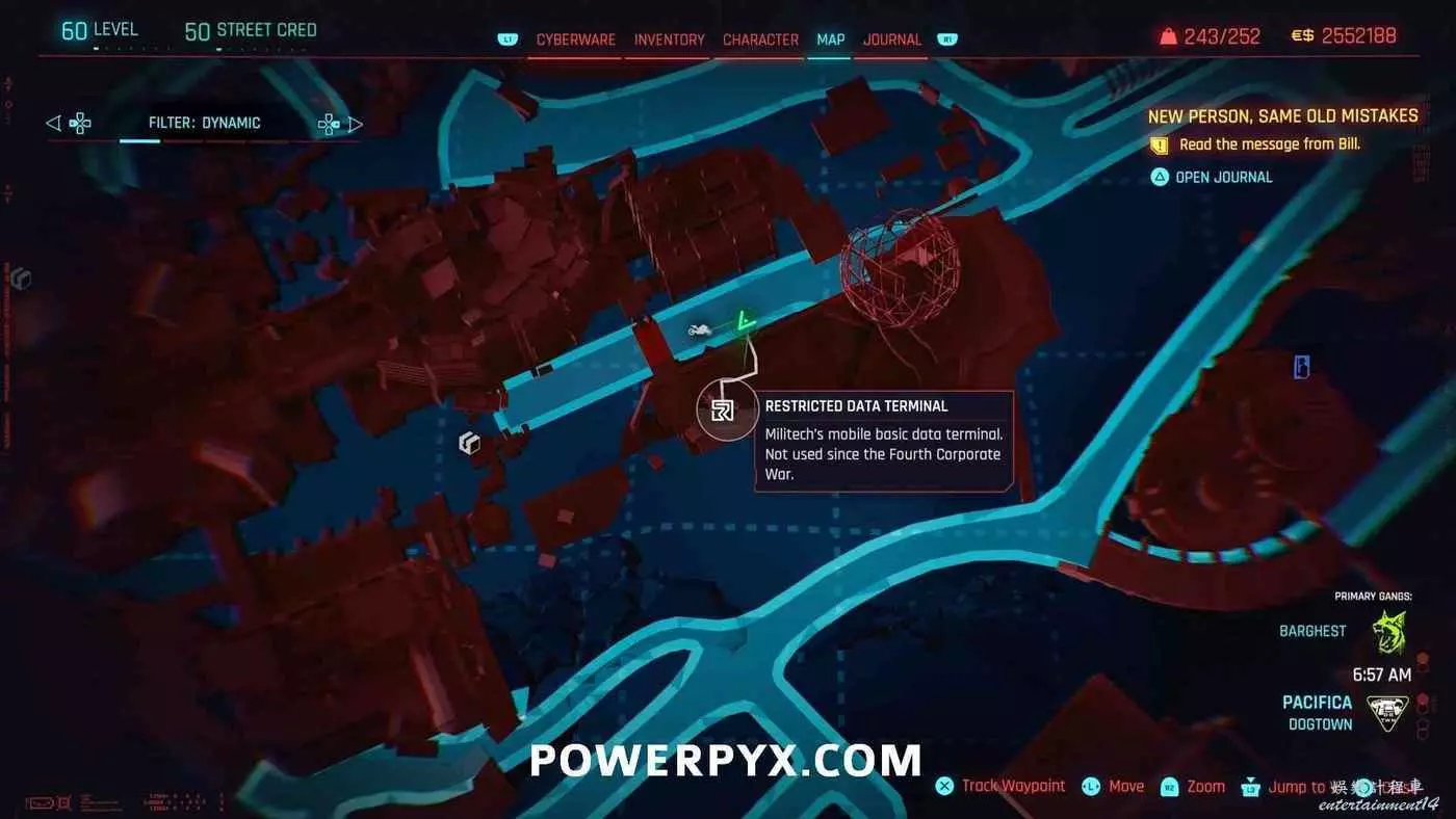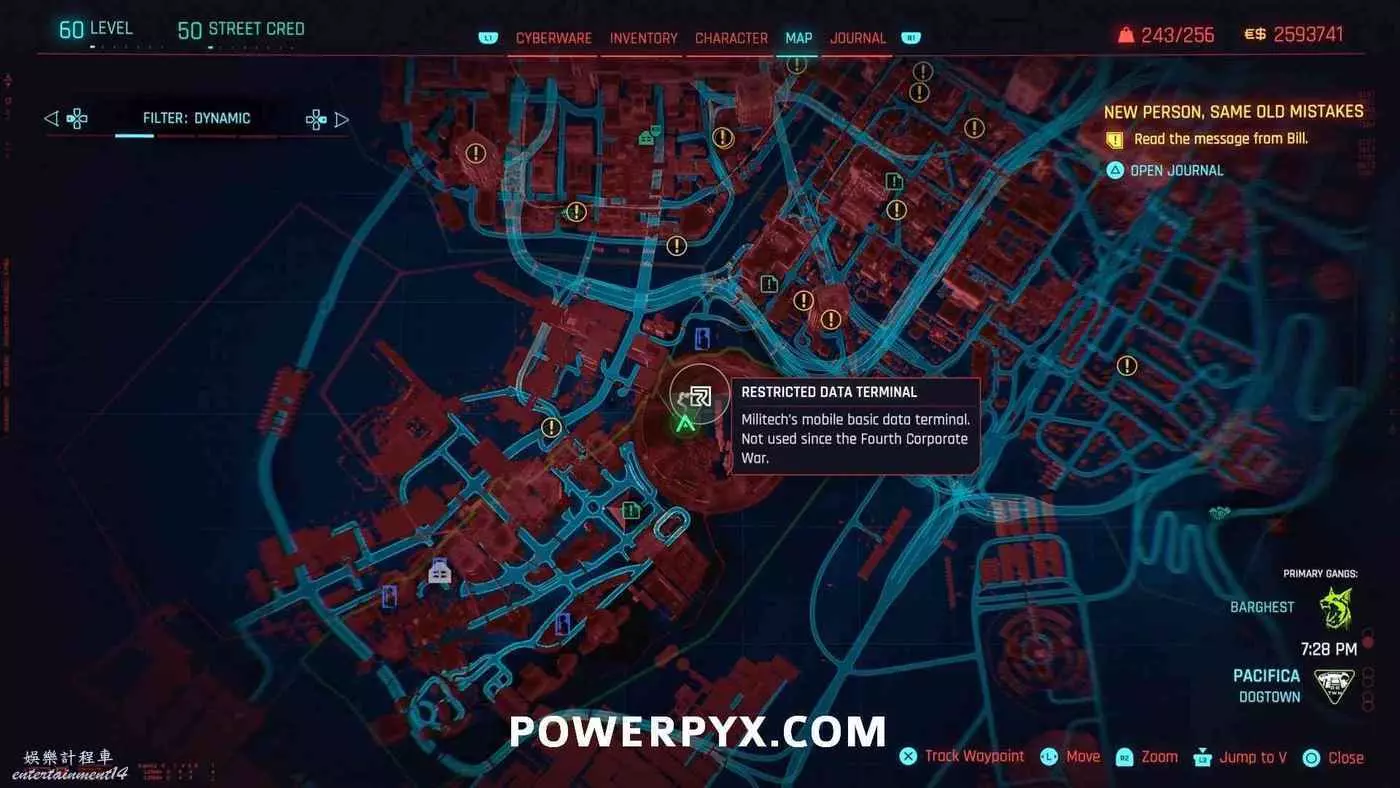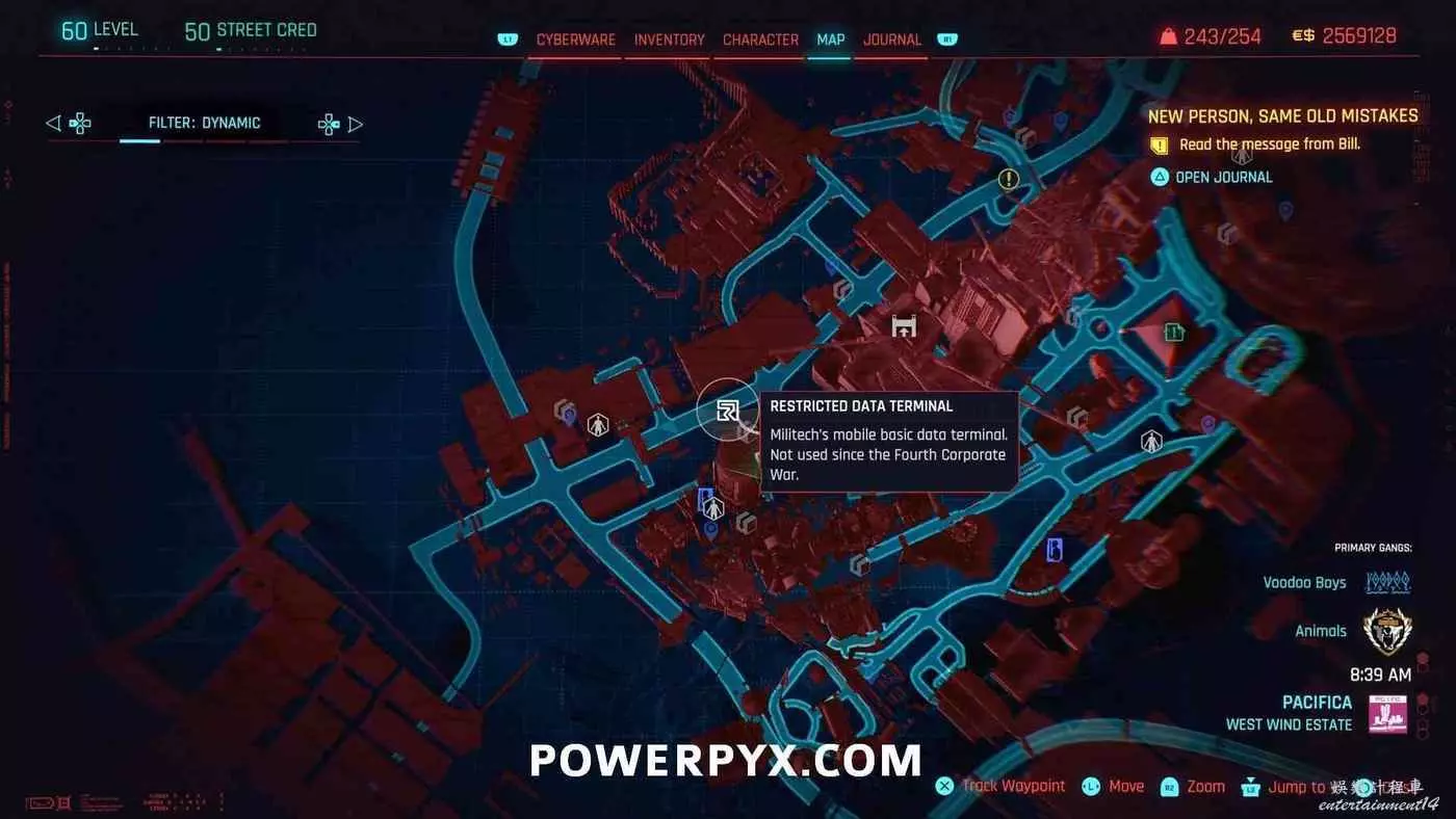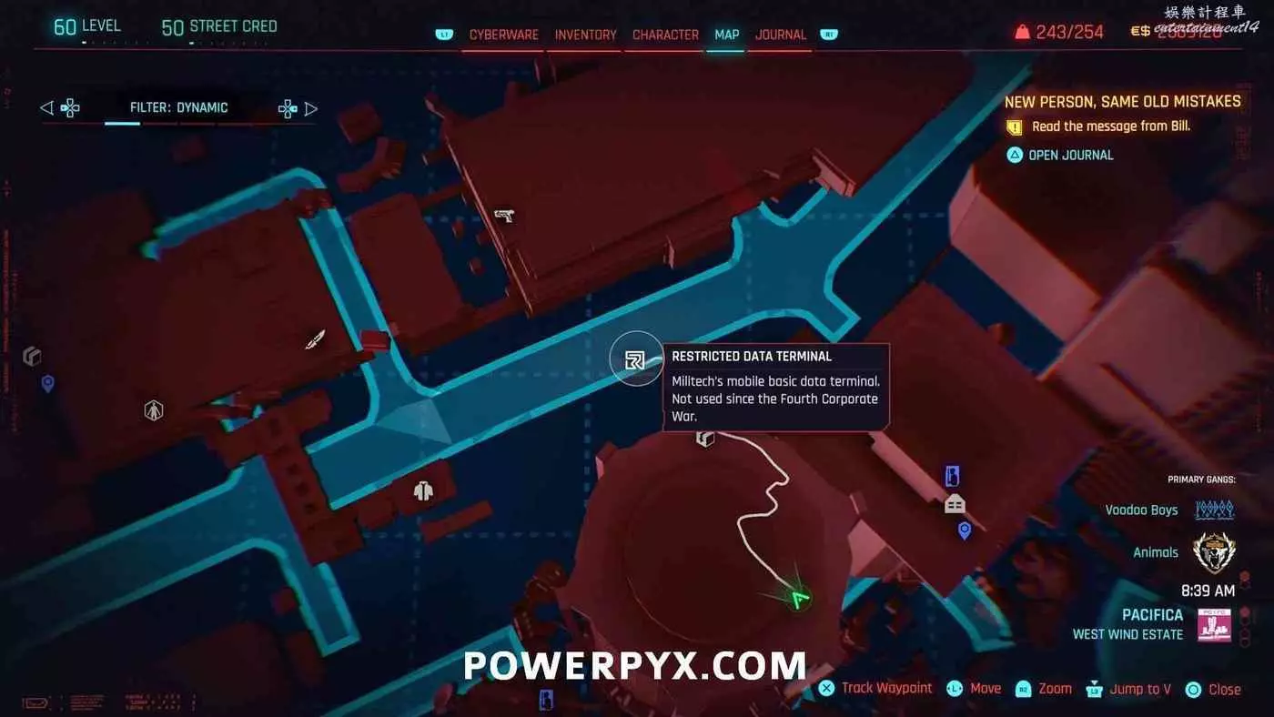 從克雷斯街傳送點往難走,找到【犯罪活動升級】標記(地圖上的綠色三骷髏圖示),進入敵人基地,穿過隧道進入一個敵人超級多的房間,軍用科技資料終端就在左側上鎖的房間內。肉體屬性夠的話可以強行開門,也可以通過該房間下層地板上的網格門,利用通風管道爬梯子進入該房間