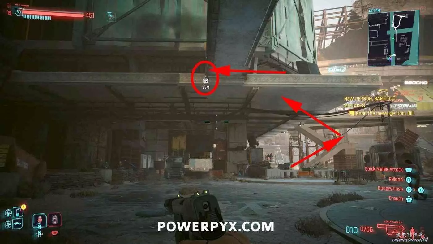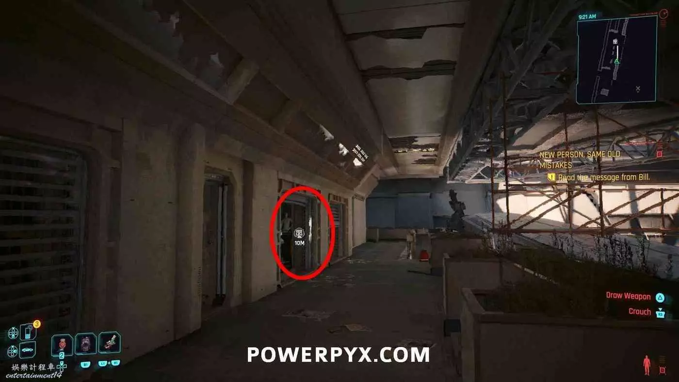 位於終端圖示標記旁邊的一棟樓裡,在建築一側可以看到一處坡道、一個架子和一台綠色起重機。利用坡道跳到架子和起重機上,再跳到頂部即可看到軍用科技資料終端。