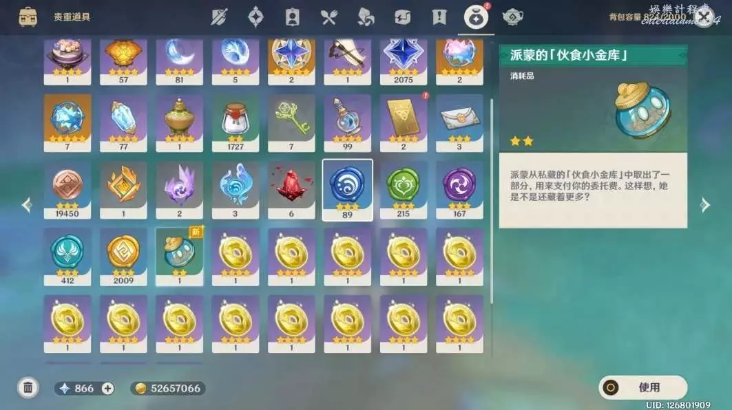 15,派蒙的【伙食小金庫】使用後可獲得15000摩拉。