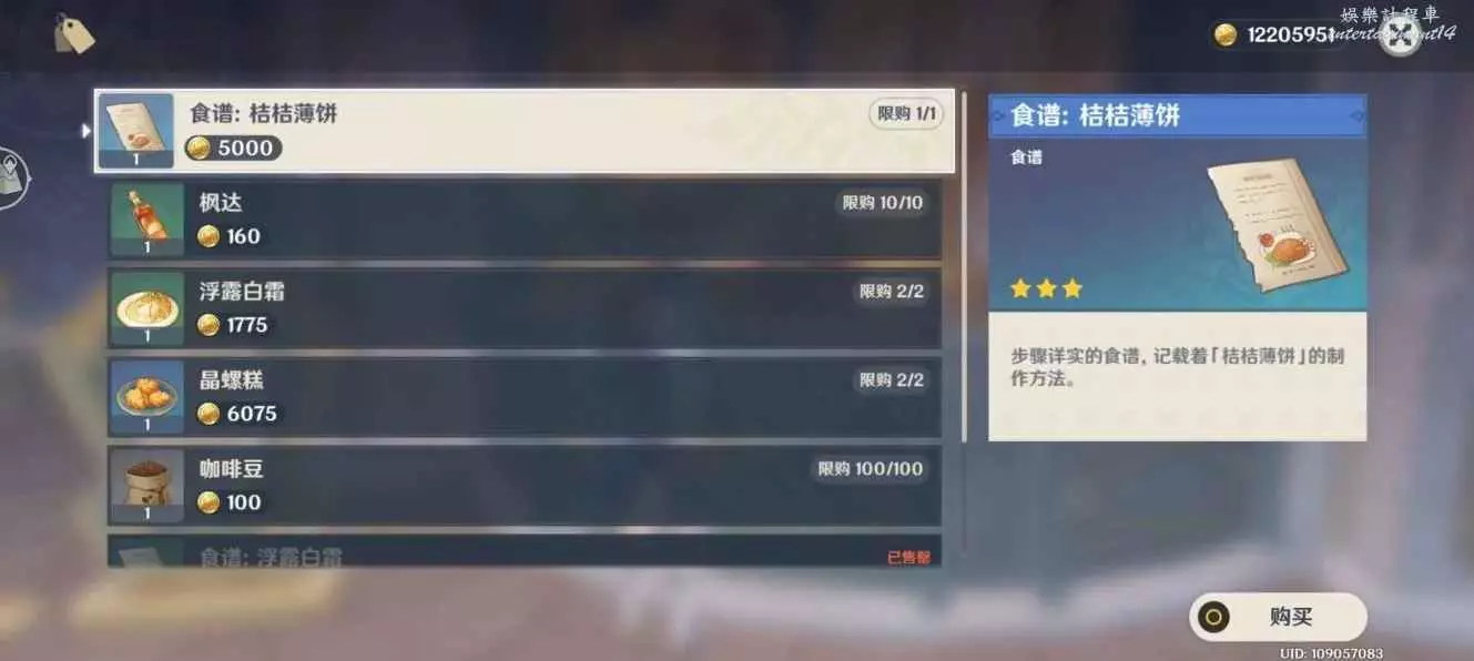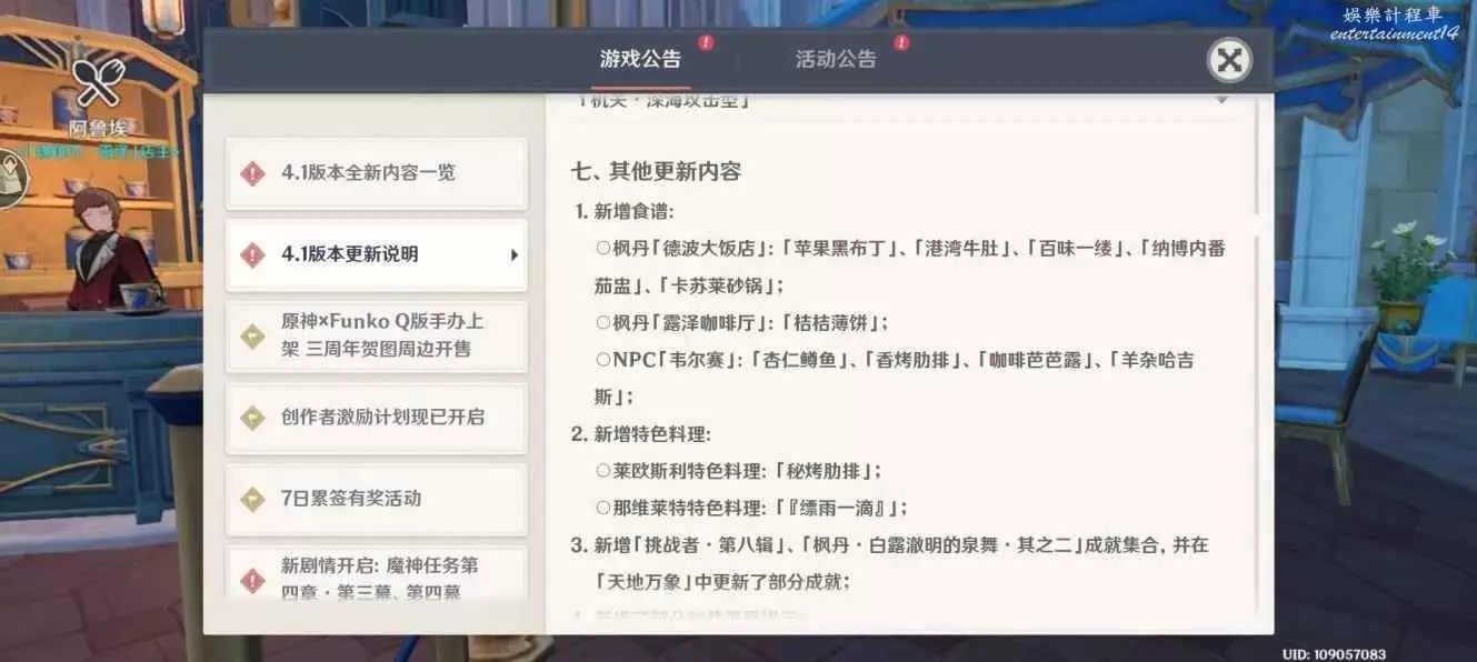 原神 (Genshin Impact) 4.1版新增食譜獲取方法 27 9 月 2023-09-27 廣告 作者:K423突變體 來源:米遊社論壇 4.1食譜收集,總共10份料理。 楓丹「露澤咖啡廳」:「桔桔薄餅」 楓丹「德波大飯店」:「蘋果黑布丁」、「港灣牛肚」、「百味一縷」、「納博內番茄盅」、「卡蘇萊砂鍋」 ONPC「韋爾賽」:「杏仁鱒魚」、「香烤肋排」、「咖啡芭芭露」、「羊雜哈吉斯」 需要特許卷
