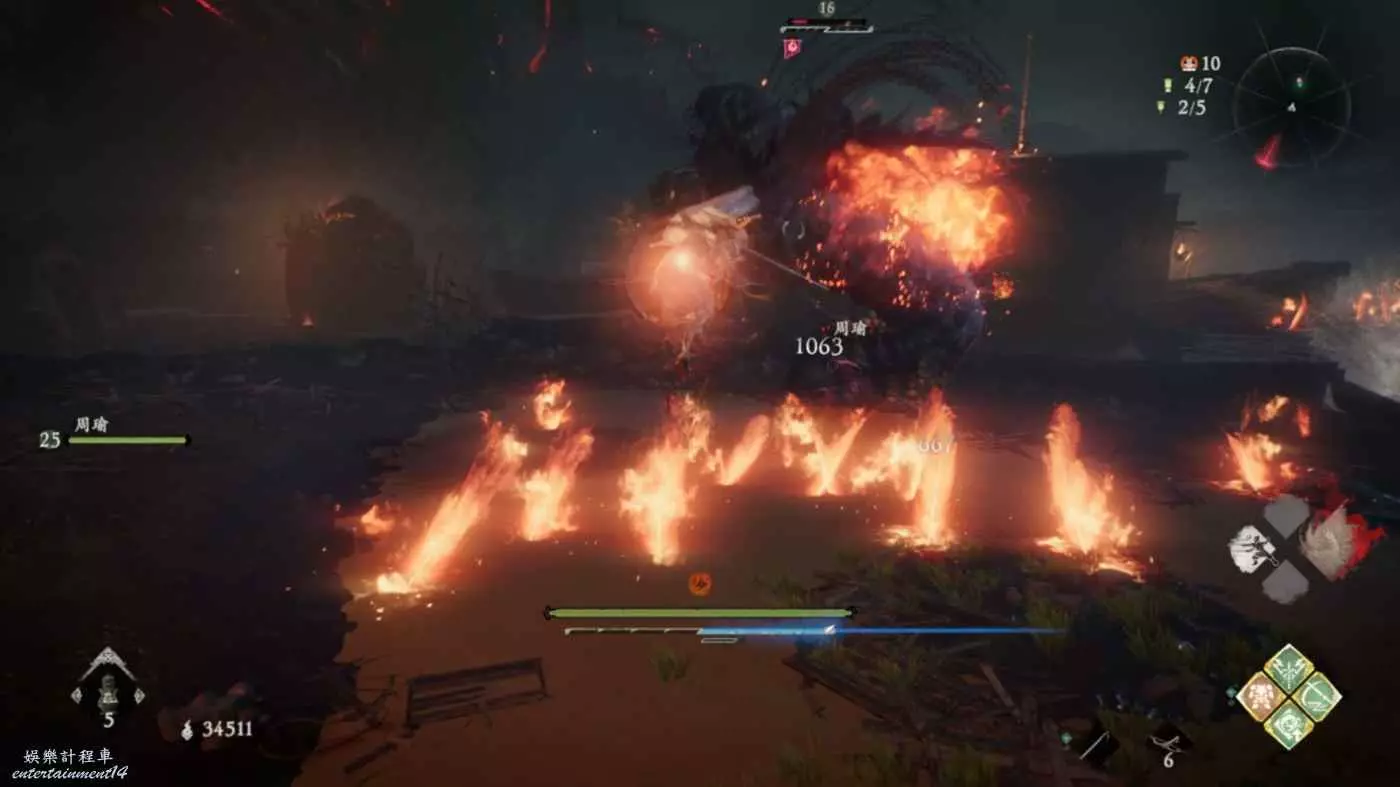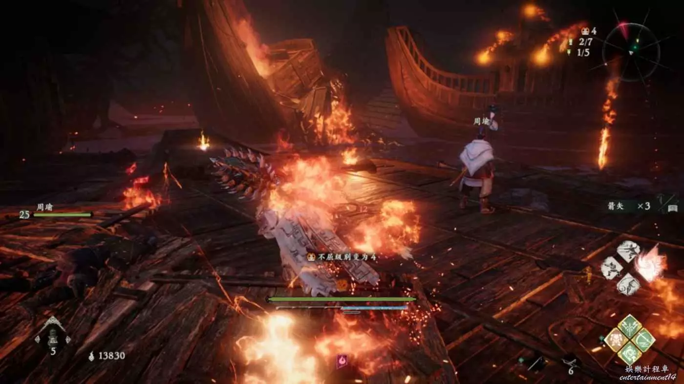應該是第一個關卡還是可圈可點,儘管用的水-船組合略有即視感,但是敵人的火箭如雨,要設法找准空隙閃傳騰挪避開敵人的攻擊,但是最終可以找到運油船沖爆敵人的火箭船——這一段的火箭&油船也讓人想到了赤壁之戰的場景。