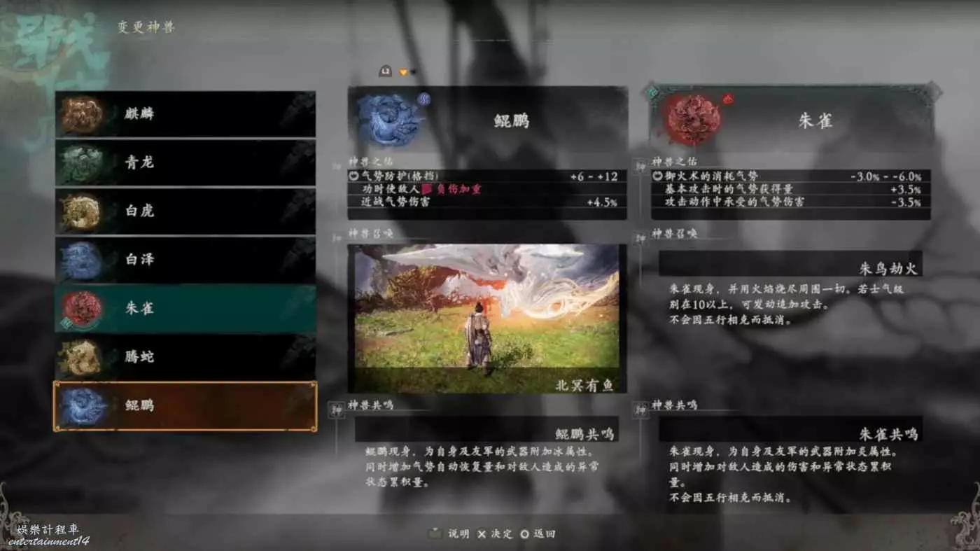 然後在DLC2中可以獲得的新神獸鯤鵬也是在太史慈*身上,鯤鵬會大範圍的各種冰凍攻擊,有點像是翻版的朱雀,不同是可以大幅度的削減敵人的氣勢條,讓玩家更容易觸發處決效果,不過相對於朱雀“刀陣旋風”的火焰散射效果,鯤鵬對於地面正面的群體敵人會更多的有效的多。