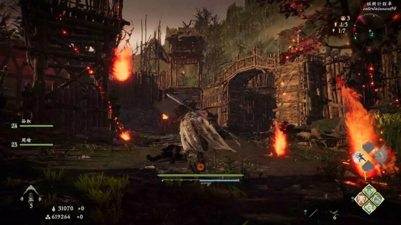 不過雖然第一個關卡讓我覺得臥龍又行了,但是後面的二個關卡,分別是沒給我留下太多印象的山林和沒給我留下太多印象的城寨——這兩地形分別是比較明顯的取材於第2章和第3章,但是又少了第2章山林的縱深設計,以及第3章各種上下房頂的路線探索感,總的來說感覺大概是一般吧,優勢大概是不容易迷路了,很快就能推進到BOSS房門前(但是要找全旗子還是要費一些工夫)。