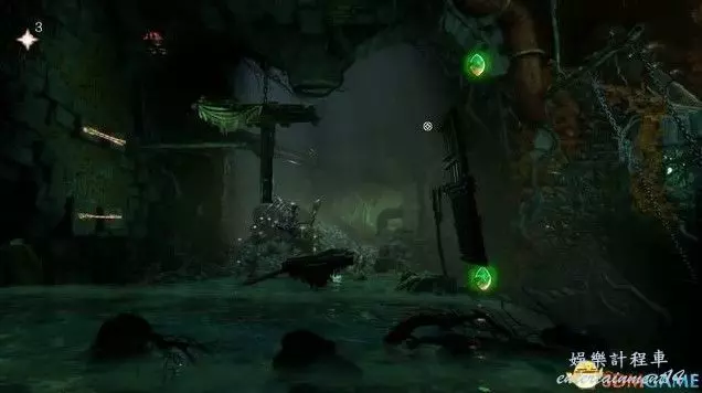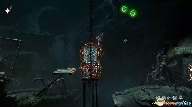 用右側箱子反彈射中開關後,拉下牆上圓環機關拿到經驗5-8