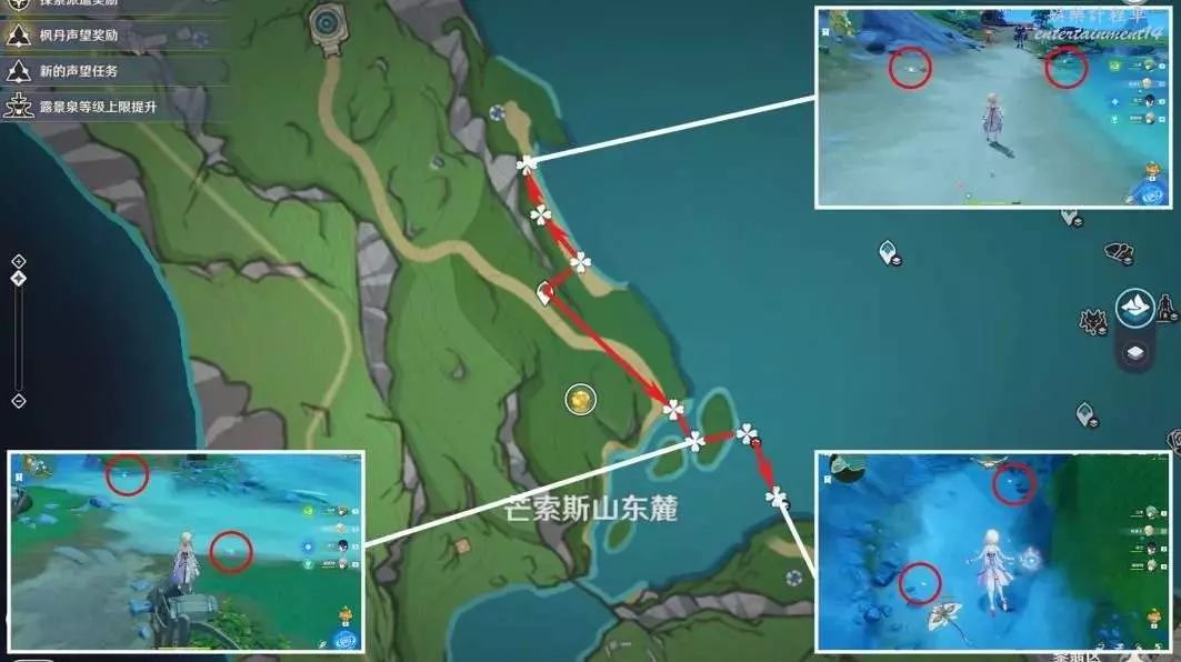 5,芒索斯山東邊的海裡,雖然數量較多,但水中採集有點麻煩,找起來也麻煩,可以先跑一次試試