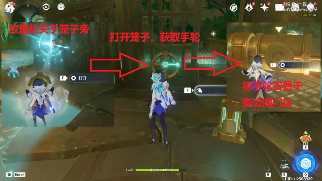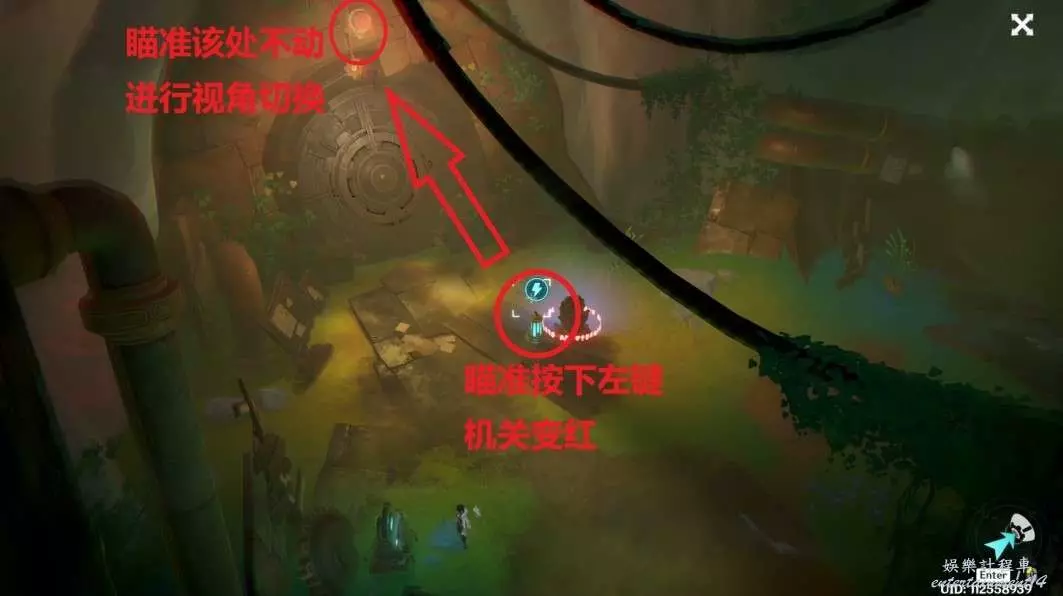 切換視角後,瞄準籠子旁紅色儲能機關,按下左鍵或回車,使機關變藍
