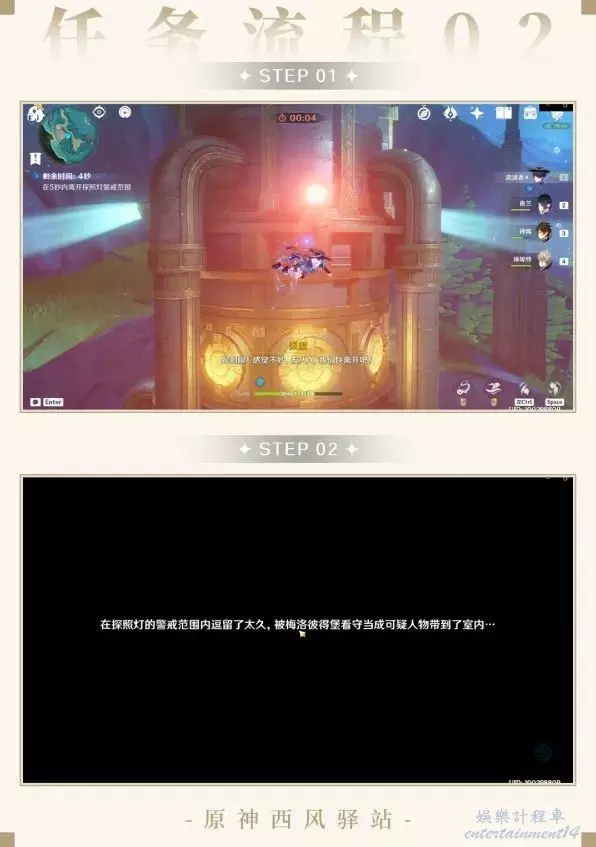 02、遊到靠近探照燈的位置,讓角色處於探照燈的照射下維持5秒,隨後進入梅洛彼得堡。這裡補充一下,除了此方式外,還可以通過完成相應魔神任務和梅洛彼得堡附近的一處管道進入其中,有興趣的旅行者可以自行搜索查看。