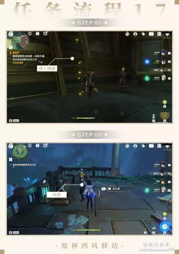 16、醒來後,離開房間,來到傳送點旁邊的樓梯上。左轉,前進,與頭頂有藍色感嘆號的NPC對話,接取到任務「梅洛彼得生活場景·此路不通」。