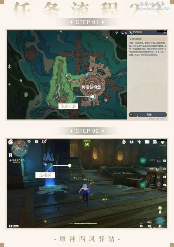 19、打開地圖,傳送至“梅洛彼得堡”字樣下方的錨點,然後右轉,沿著逆時針方向走,直到小地圖上出現藍色感嘆號,走上前面的樓梯,前往感嘆號所在位置,接取到任務「梅洛彼得生活場景·壞買賣」,按照任務提示完成即可,獲得特許券*280。