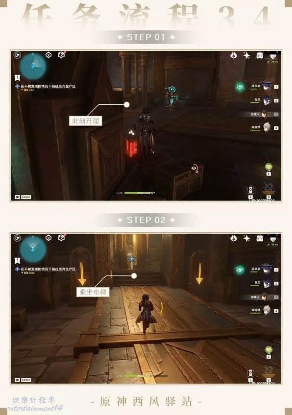 34、等待守衛靠近裝置,待其頭頂的眼睛不變紅時前往電梯位置,乘坐電梯來到廢棄生產區。