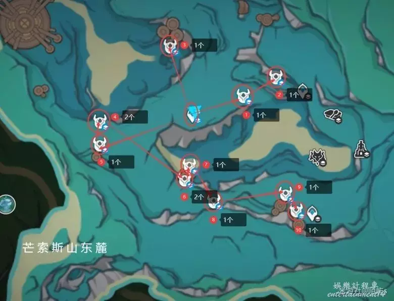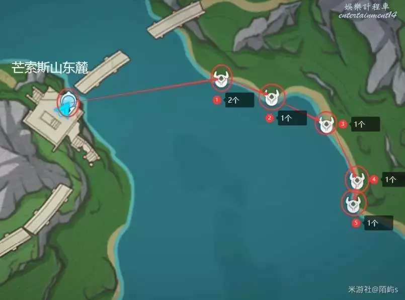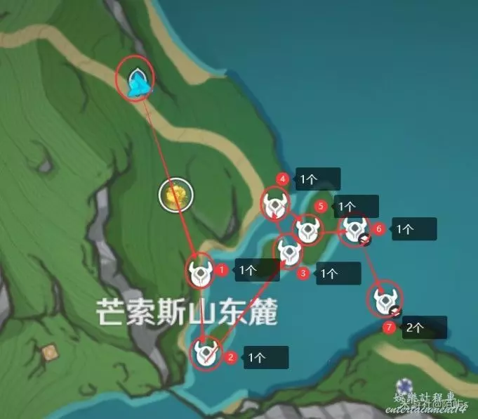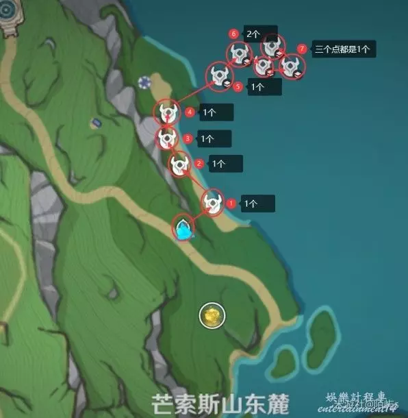 ➣ 來到芒索斯山東麓上方的傳送點,朝著小地圖的下邊一直走,走到海灘就能看見一個幽光星星。