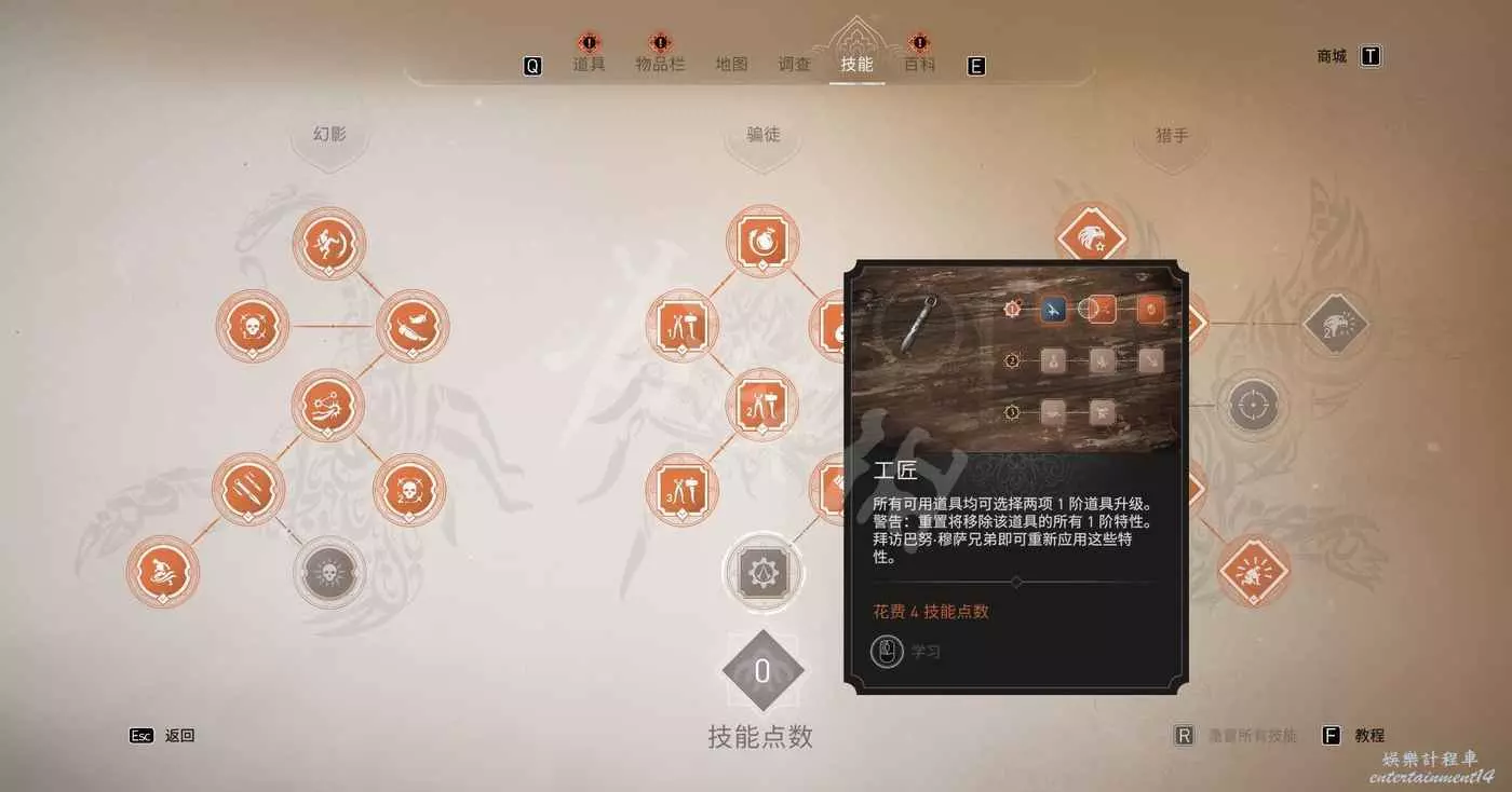 技能分為三類,幻影、騙徒和獵手,幻影系技能會強化巴辛姆的刺殺及戰鬥手段,騙徒系技能會強化道具的使用,獵手系技能會提高鷹眼視覺以及巴辛姆的資訊獲取能力。