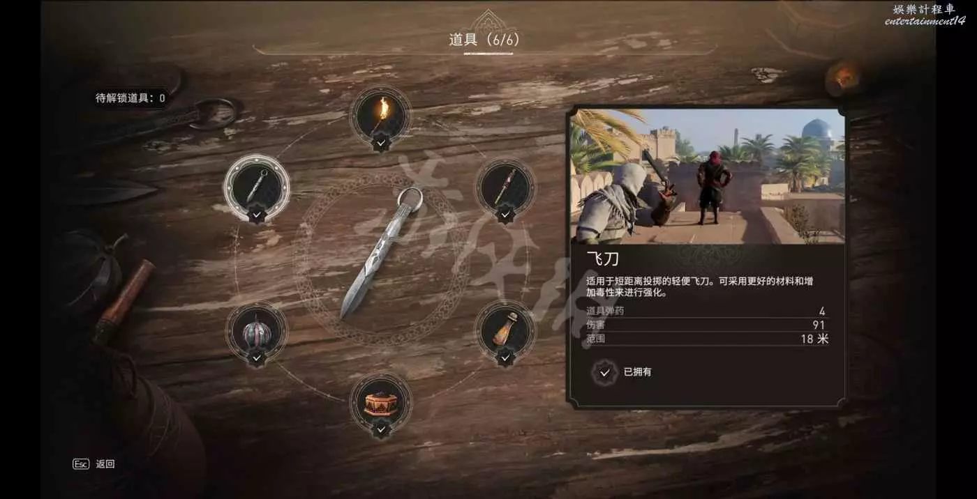 道具共有六種,分別是火把、飛刀、吹箭、噪音彈、煙霧彈和陷阱。期初只有火把和飛刀兩個可使用,通過點出技能“額外道具容量”就能解鎖更多道具的使用。