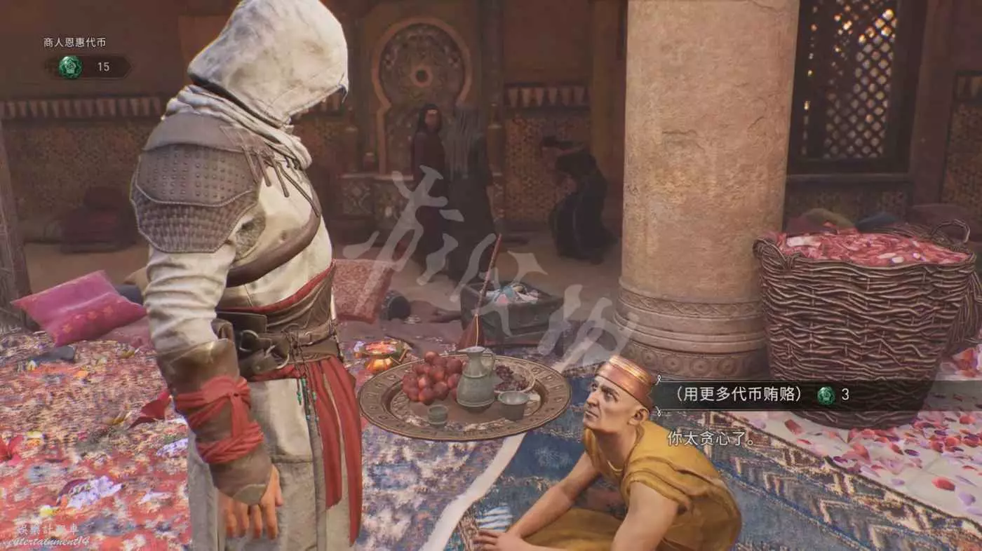 從不小心保管財物的人身上搜刮財寶。啟用鷹眼視覺時,會看到一些人的腰間荷包將發出特殊光芒。