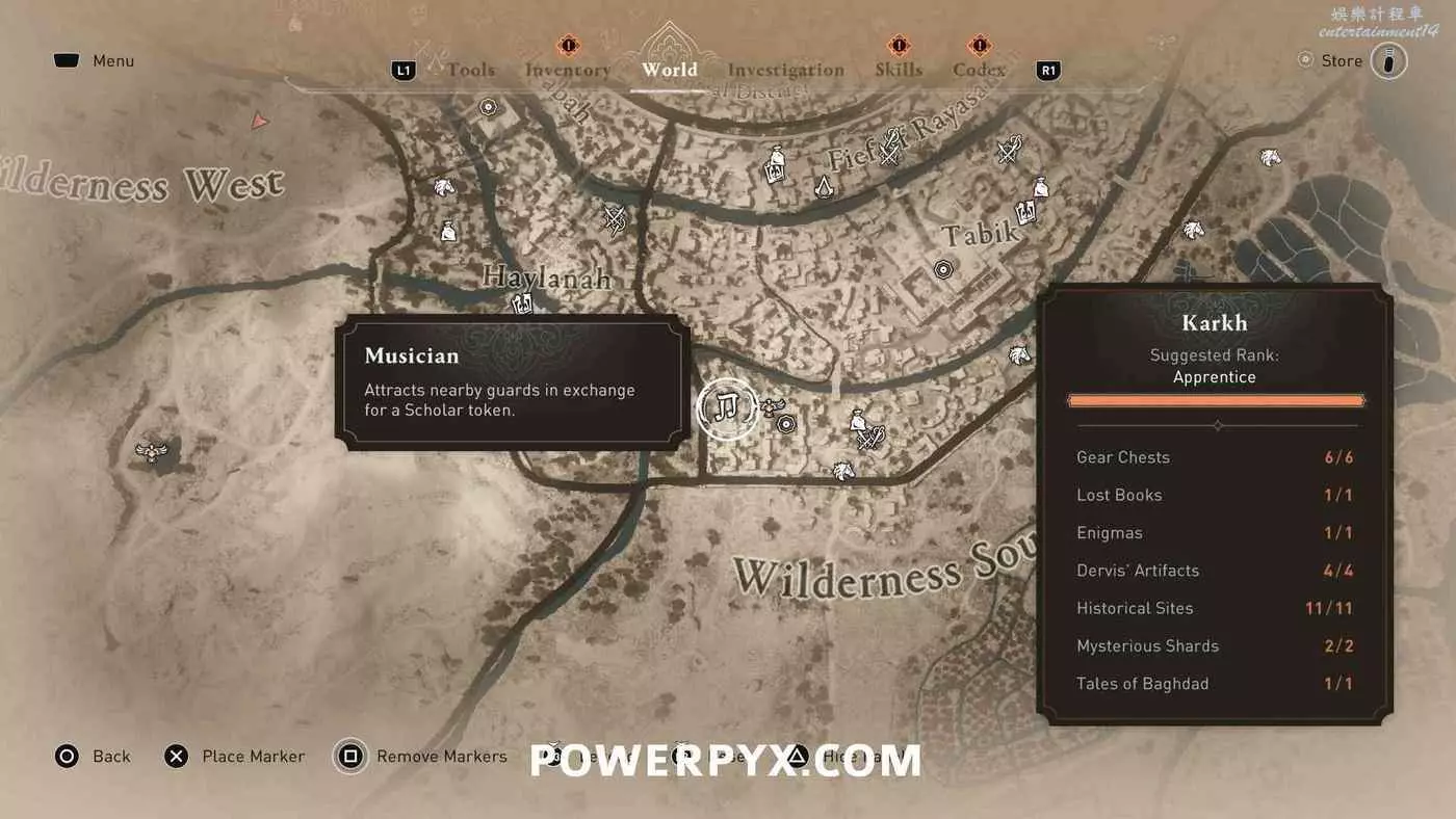 樂師在地圖上以白色音符圖示標記顯示,同步某區域的俯瞰點(鳥瞰點)後就會跟隨該俯瞰點解鎖。與其中5位互動並每人支付1個代幣(偷竊獲得)即可跳杯。
