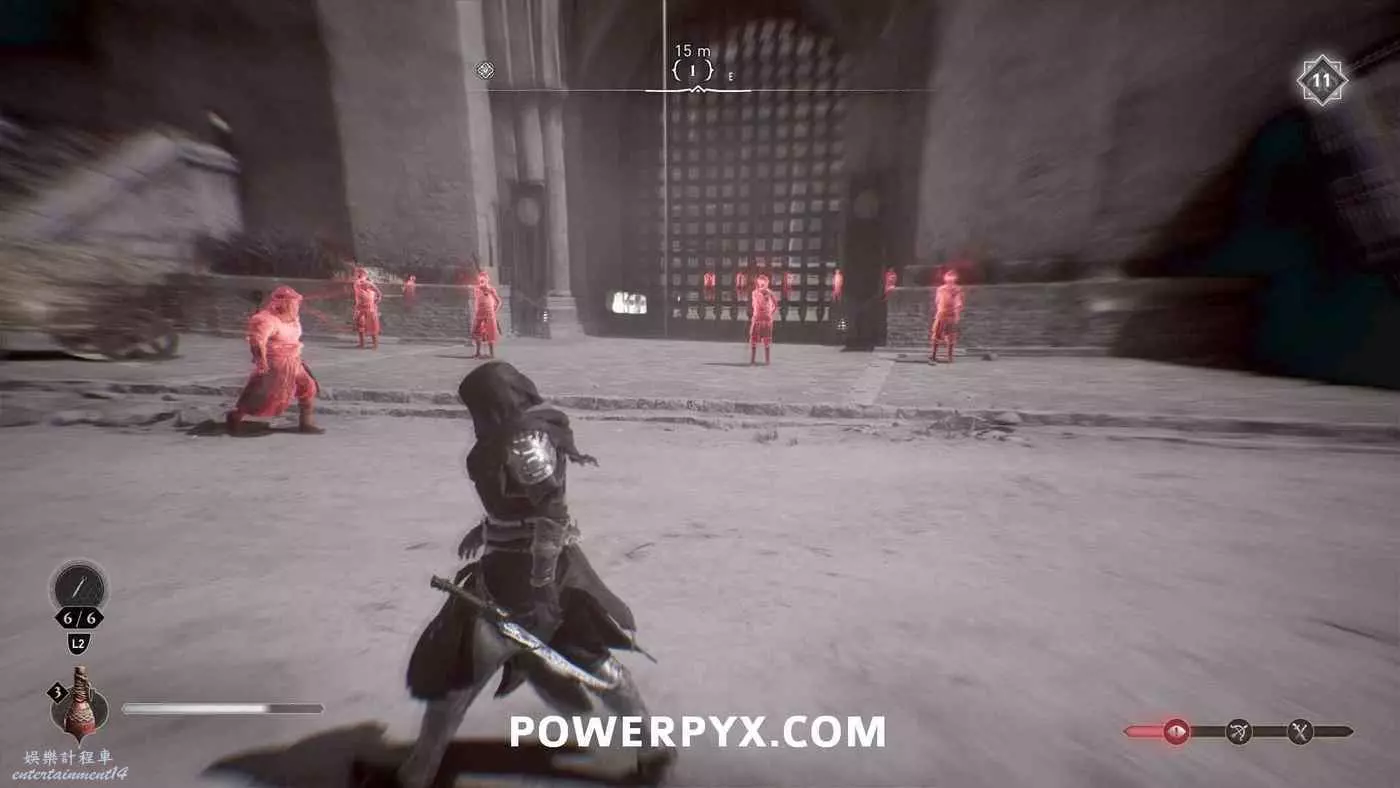 然後前往卡爾克東南角的【大軍營】,正門有5名守衛(4名站著不動1名在前面巡邏)。在非戰鬥狀態下,按R3使用刺客專注,然後按R1選擇5個目標並按×鍵確認。