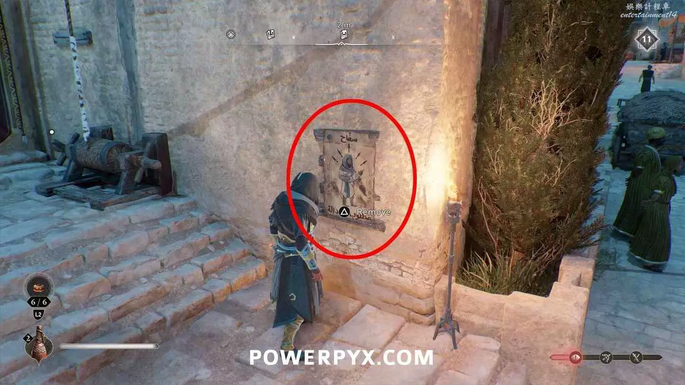 當巴辛姆的位置處於3人以上的人之間時,就會處於【混入人群】狀態。在此狀態期間,按十字鍵右吹口哨吸引敵人,然後在出現按鍵提示時按下R1暗殺目標,重複10次即可。基本可以在任意有守衛的街道上進行此操作,守衛附近大多都有人群。