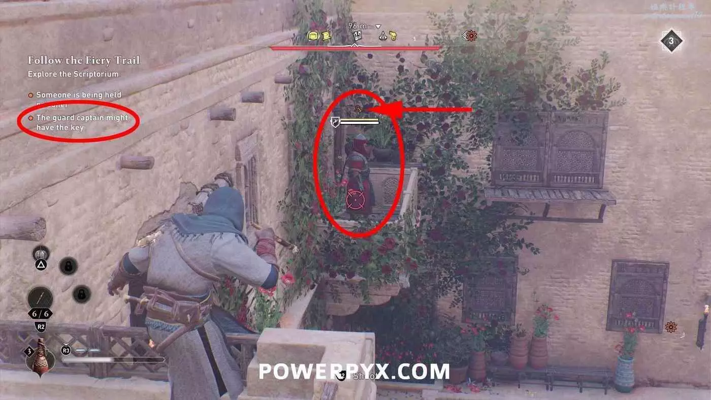 如果不知道在哪裡找帶鑰匙圖示標記的敵人,可以參考下文這一處:擊敗第一名教團成員後點擊調查板左下方分支,找到【主線任務:跟隨火焰痕跡(探索繕寫室)】-目標:守衛身上也許有鑰匙,只需在這裡提前用吹箭讓守衛昏睡即可。