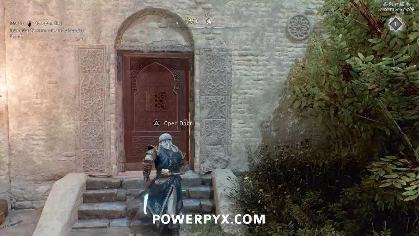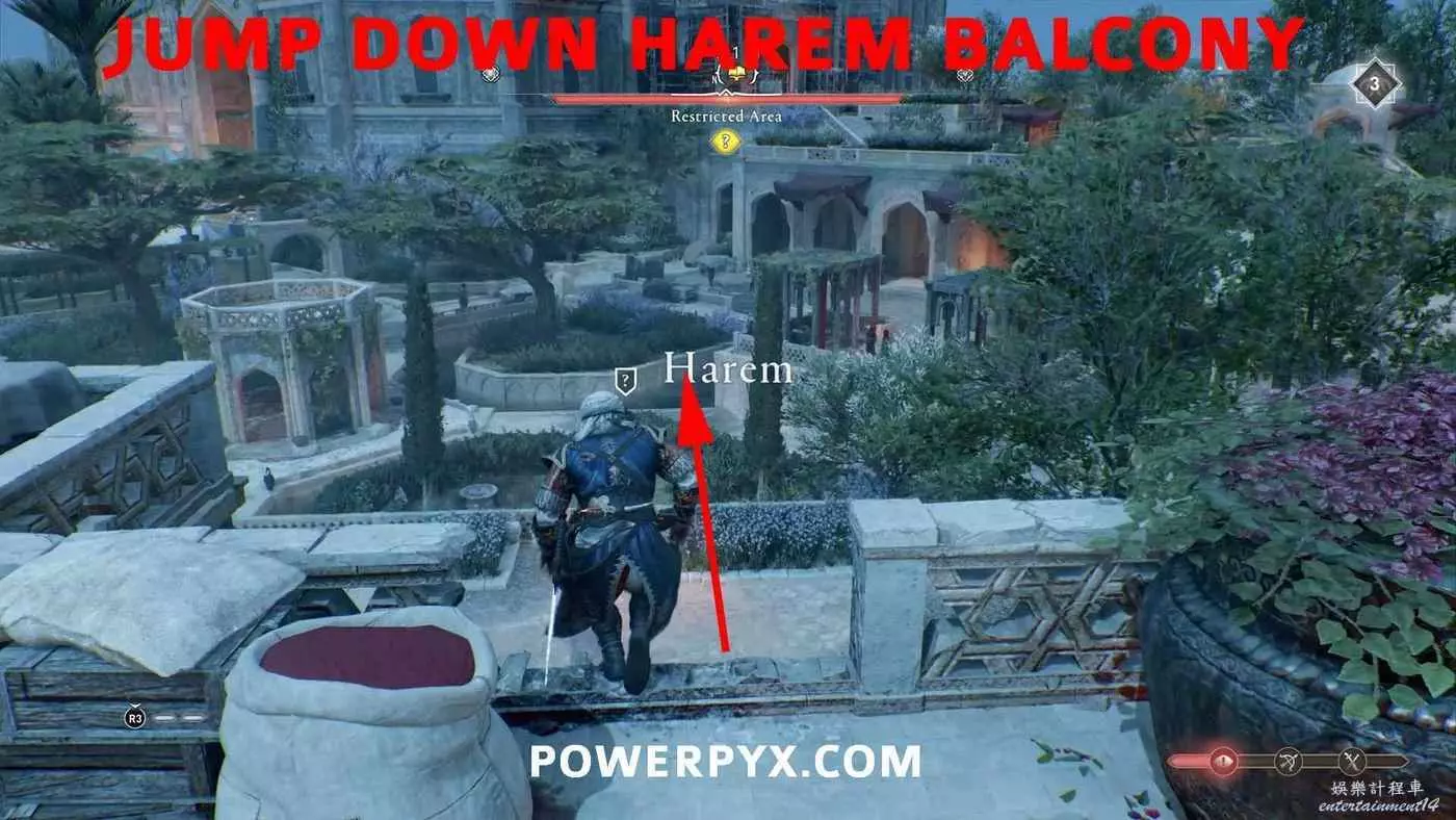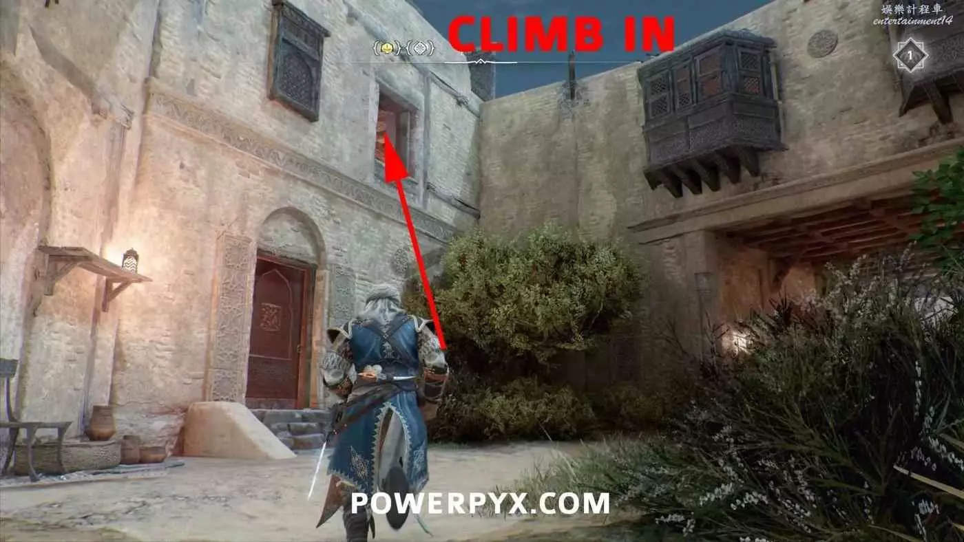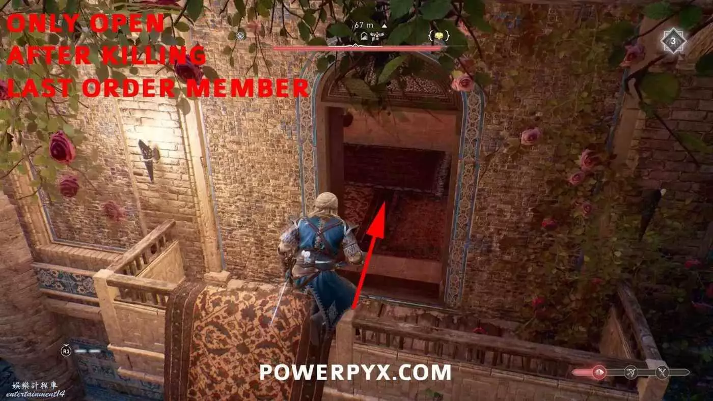 前往宮殿東南邊的牆,東南角有個露台,露台上有一扇開啟的門(通關主線前是鎖著的,通關後才會打開)。