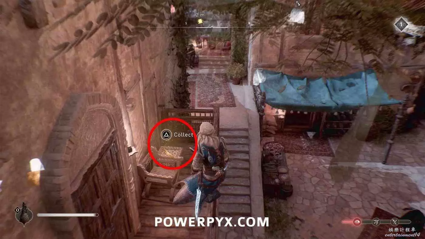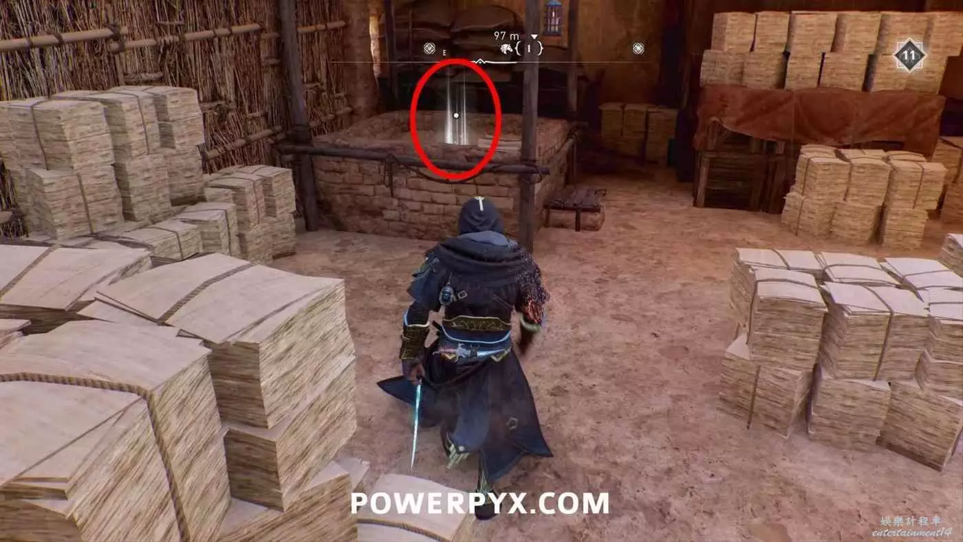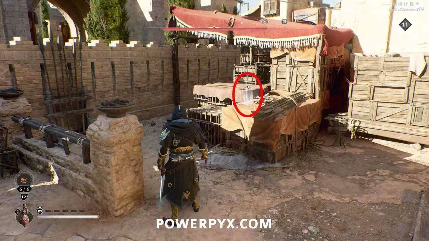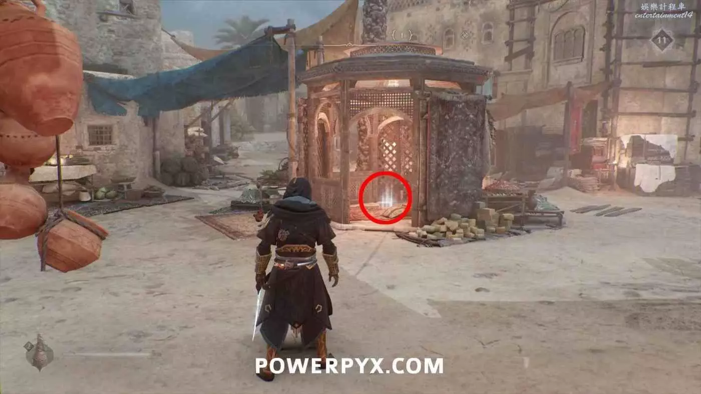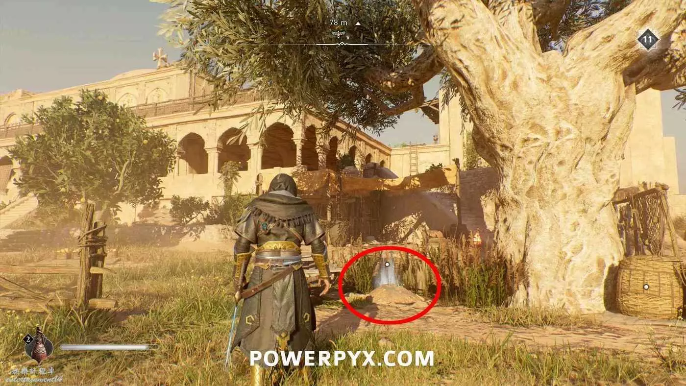 寶藏位置:位於旁邊有水車的建築內。門上鎖了,需要通過一扇打開的窗戶扔飛到進去擊中鐵窗,然後從窗戶爬進去,即可在一層沙堆旁邊找到寶藏。