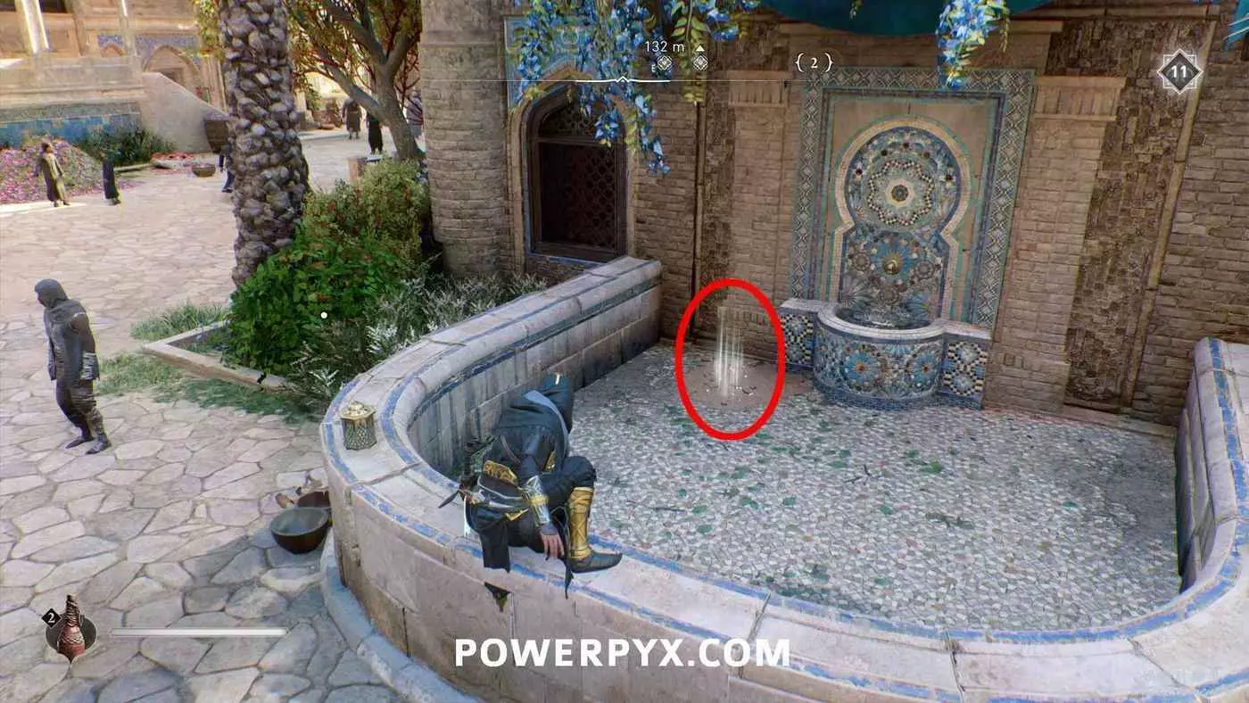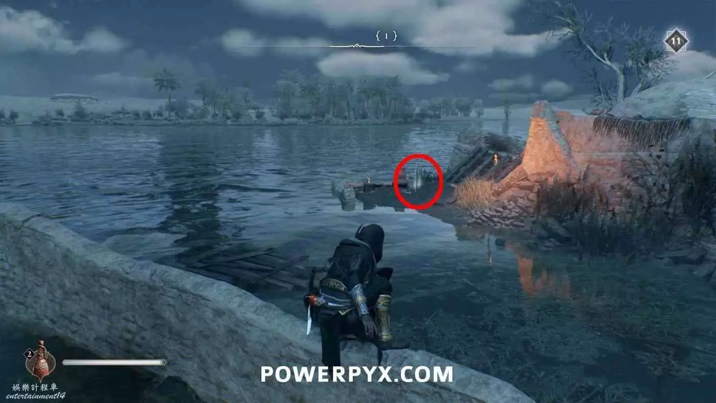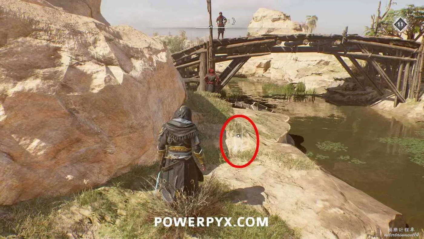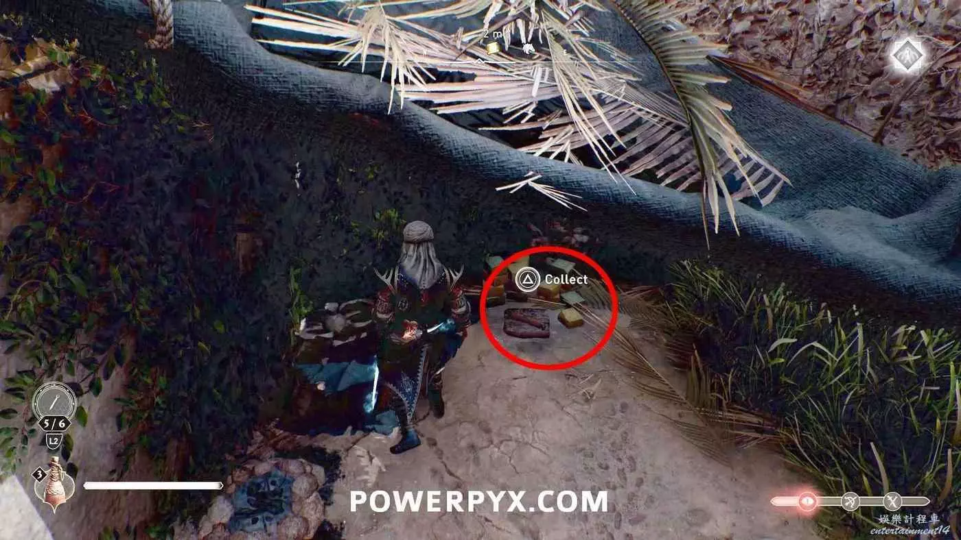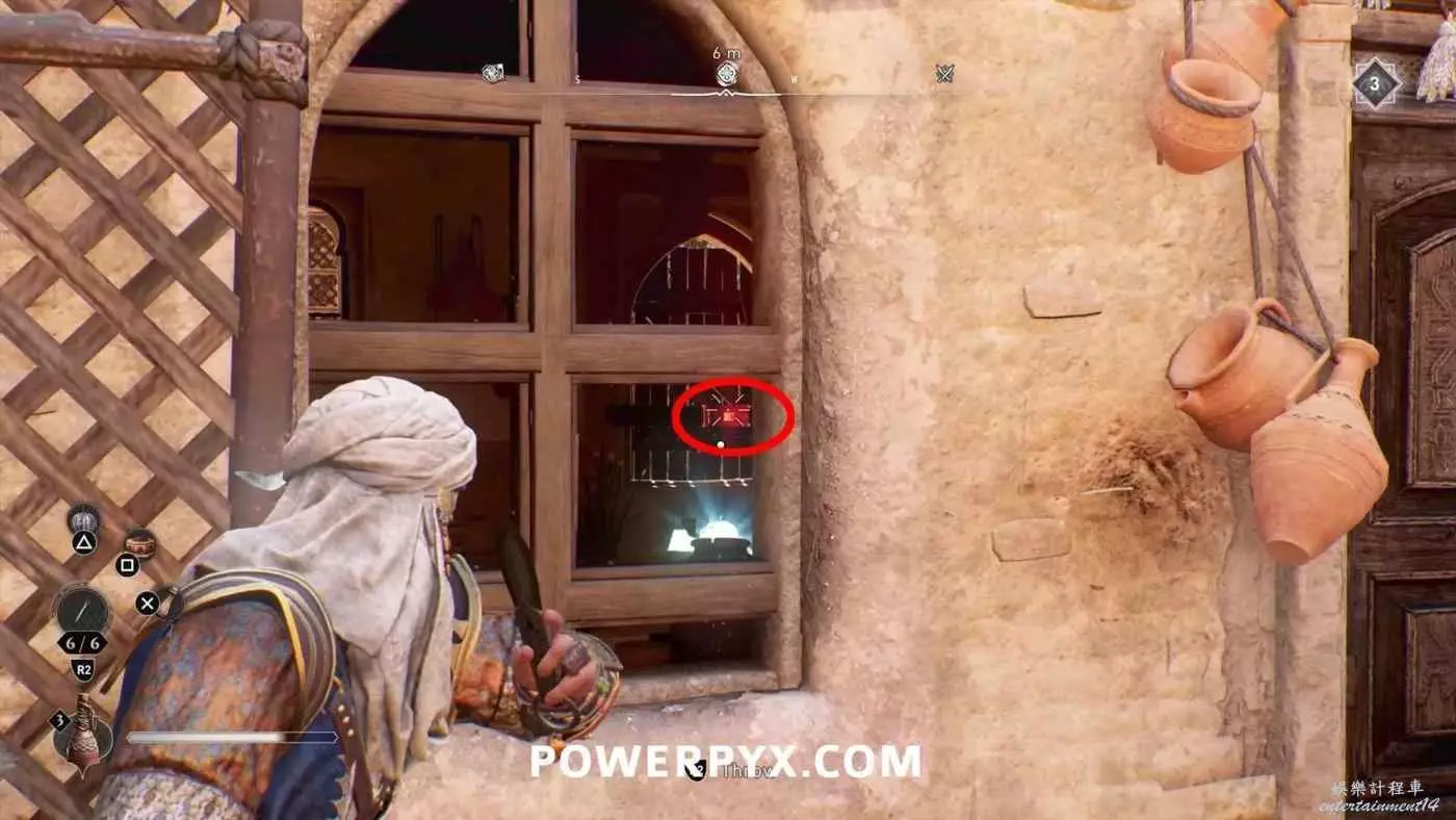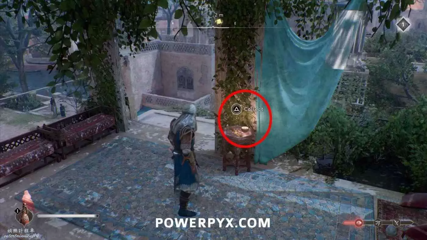 寶藏位置:位於旁邊有水車的建築內。門上鎖了,需要通過一扇打開的窗戶扔飛到進去擊中鐵窗,然後從窗戶爬進去,即可在一層沙堆旁邊找到寶藏。