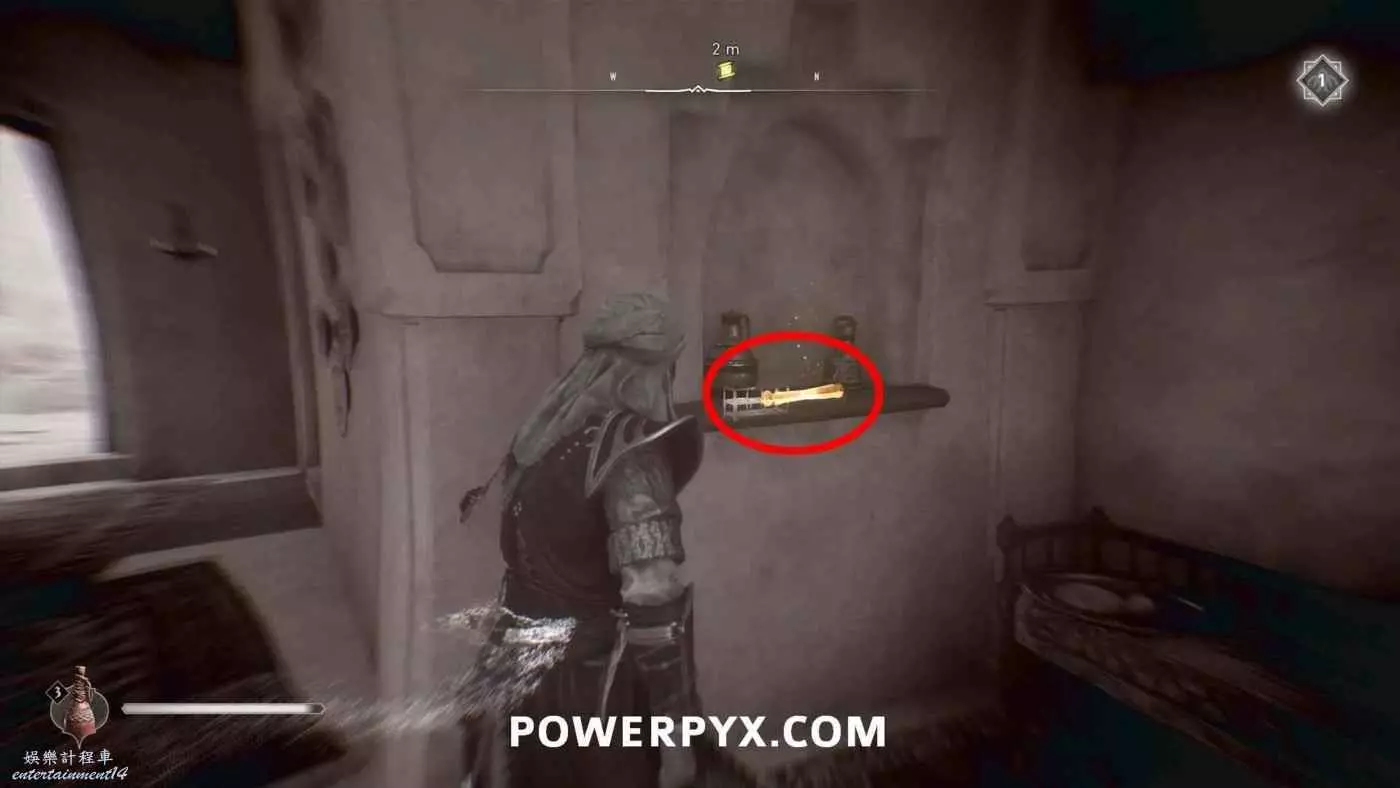 位置:在一棟房子的上層。門是封死的,先前往上層弄塌露台上的架子,架子後面有扇窗戶,從窗戶爬進去,即可前往角落放有謎題卷軸的房間。