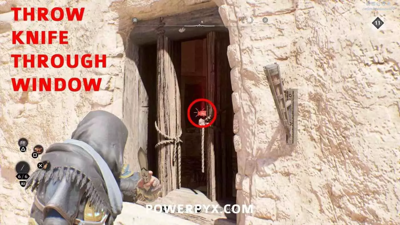 位於一棟樓的頂層。需要先從建築東側打開的窗戶扔飛刀進去擊中建築西側的一扇鐵窗上的鎖。