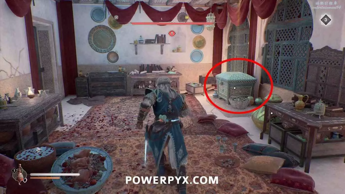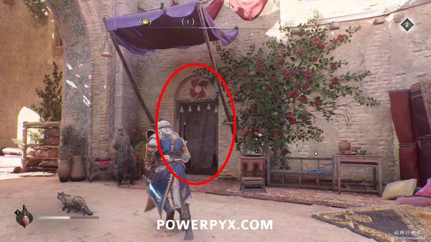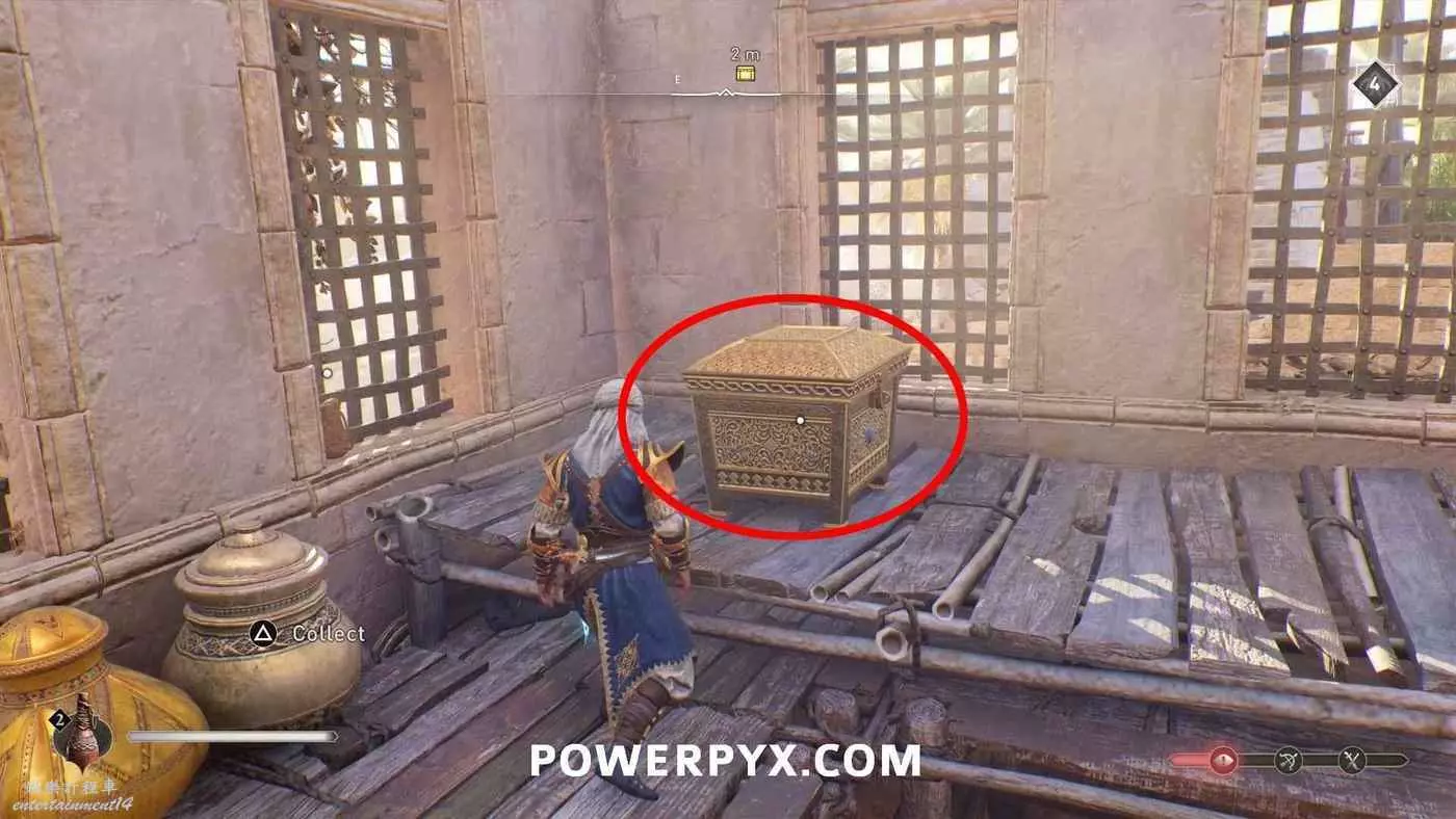 位於呼羅珊門警衛哨所屋頂上。最簡單的方法是從南邊靠近警衛哨所的大門,面對南邊的大門,從屋頂跳到牆上(有敵人的管制區域),從牆的位置利用箱子爬到屋頂即可。