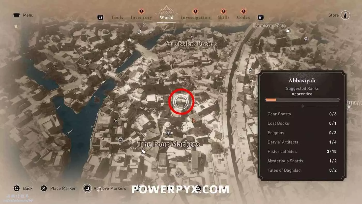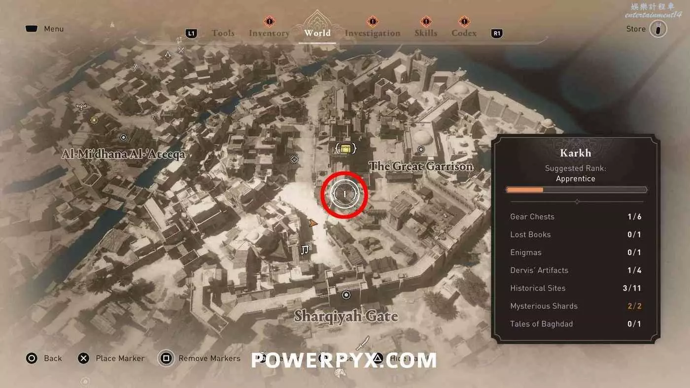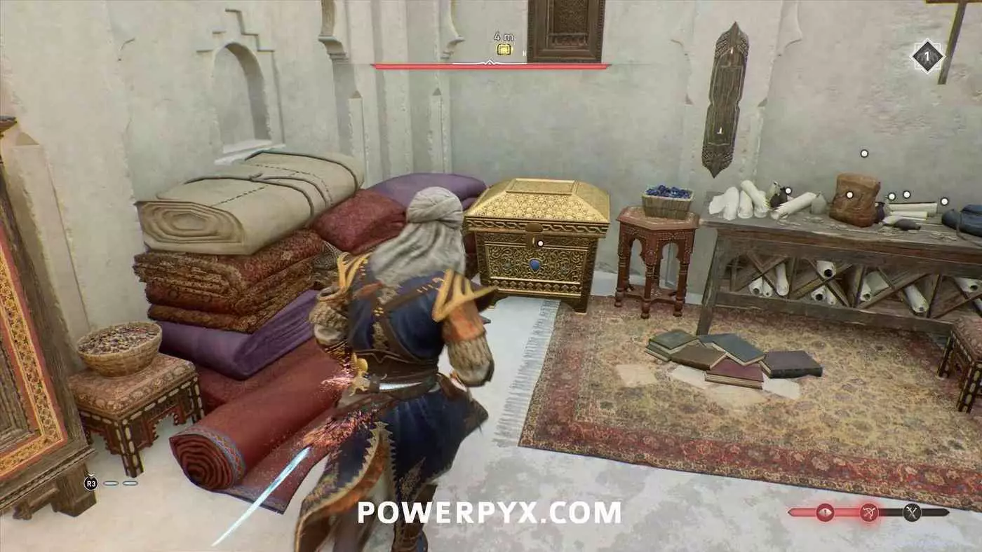 位於呼羅珊門警衛哨所屋頂上。最簡單的方法是從南邊靠近警衛哨所的大門,面對南邊的大門,從屋頂跳到牆上(有敵人的管制區域),從牆的位置利用箱子爬到屋頂即可。