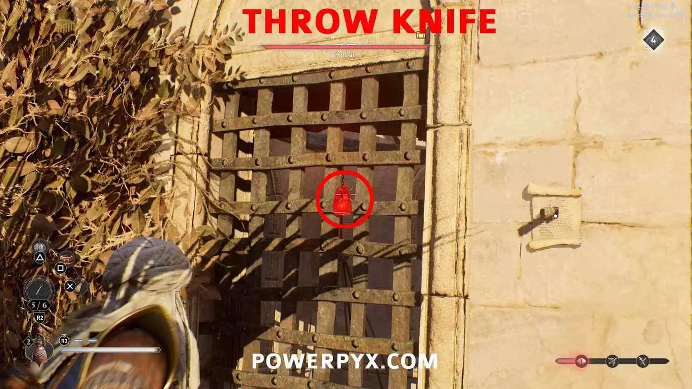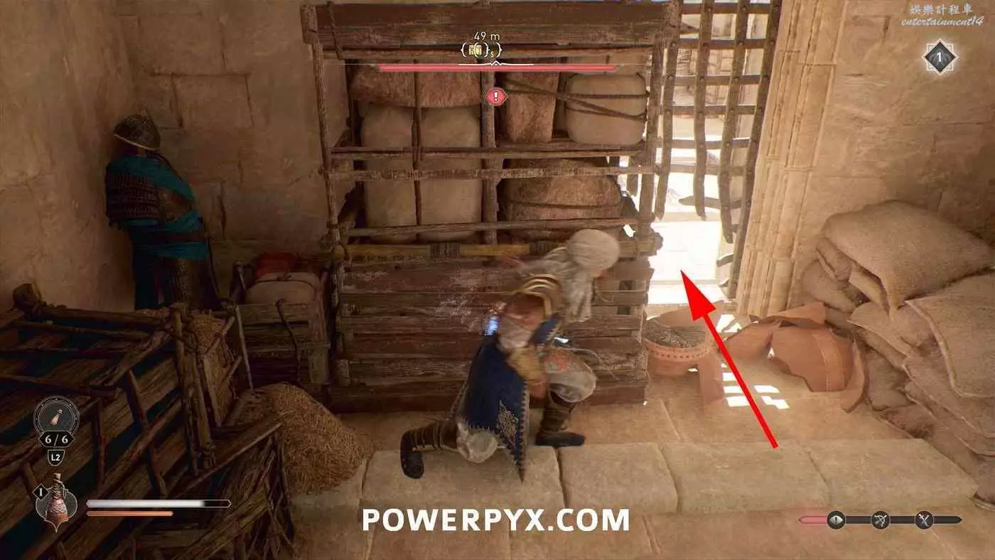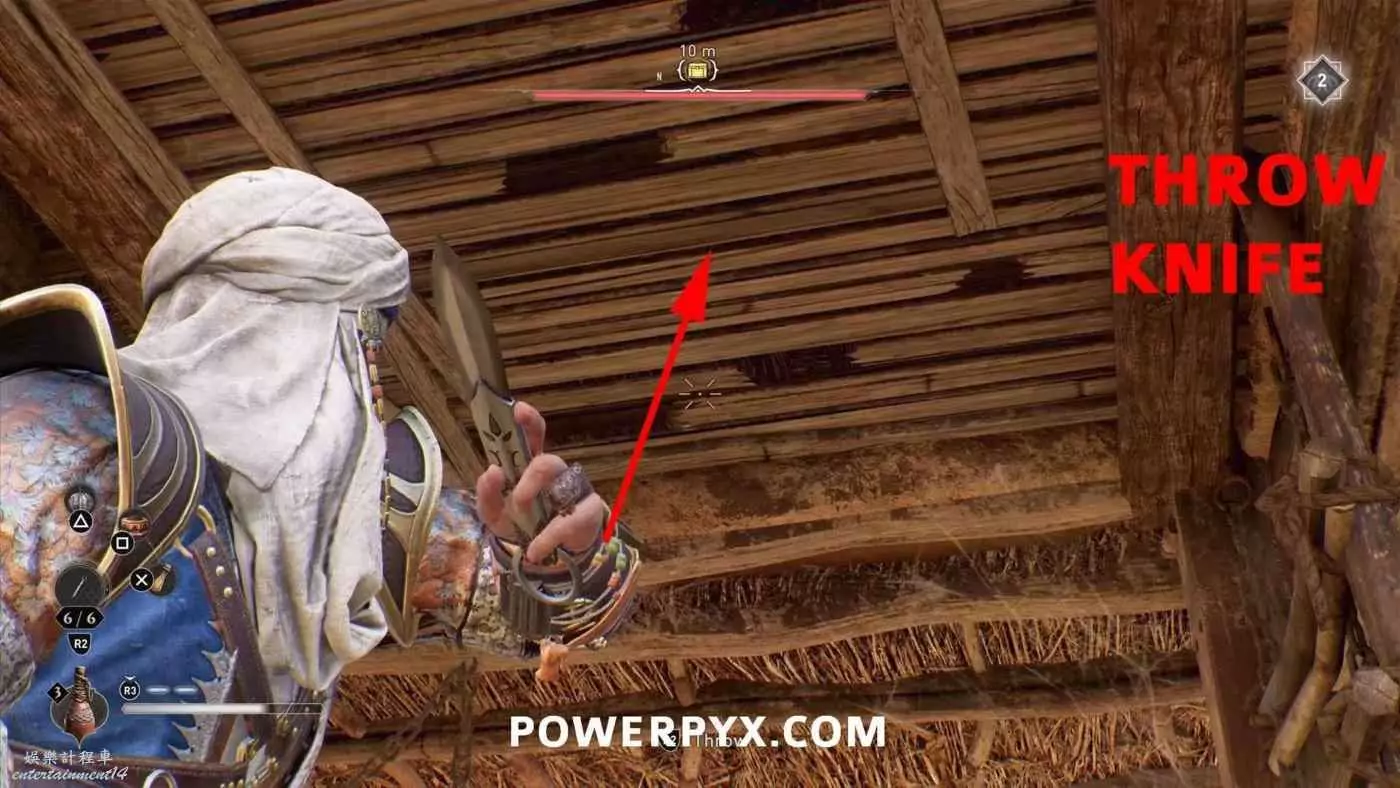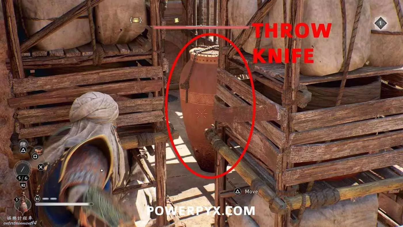 門外右側角落有幾個花瓶,用近戰攻擊打碎它們,花瓶後面的兩個架子可以推開,將左側架子往前推,右側架子原地不動,然後從兩個架子之間的開口處瞄準另一個花瓶,用飛刀打碎它。
