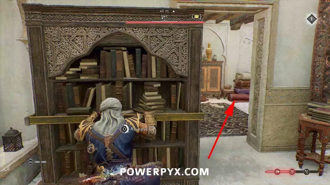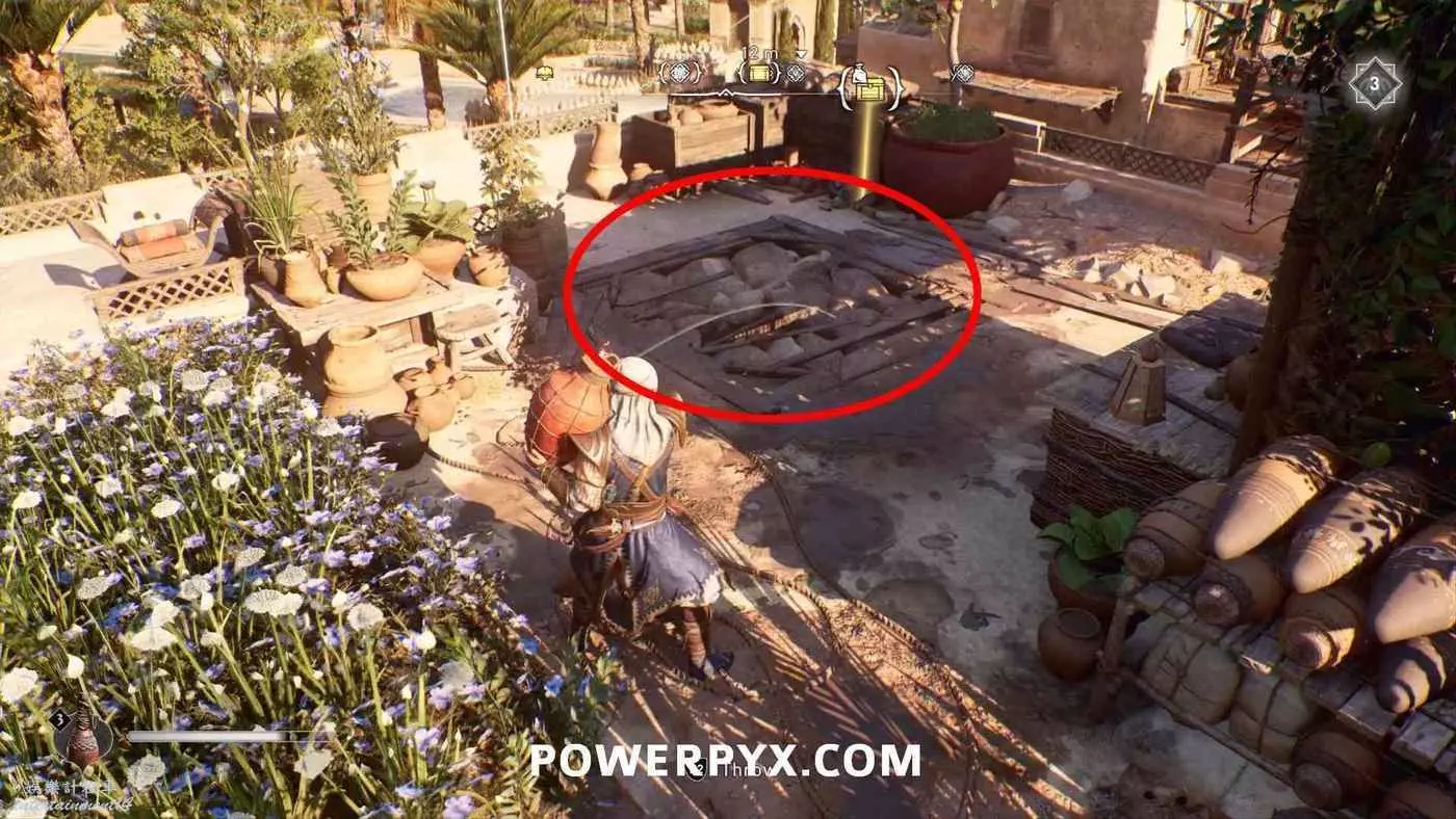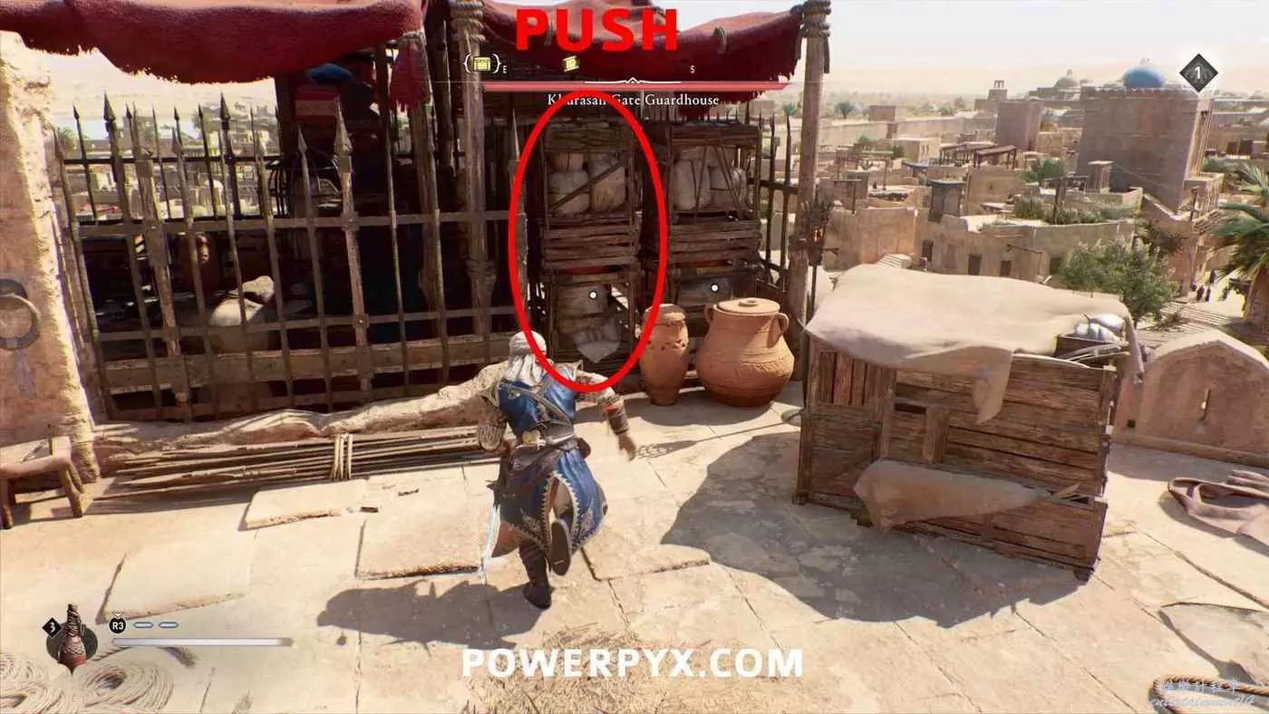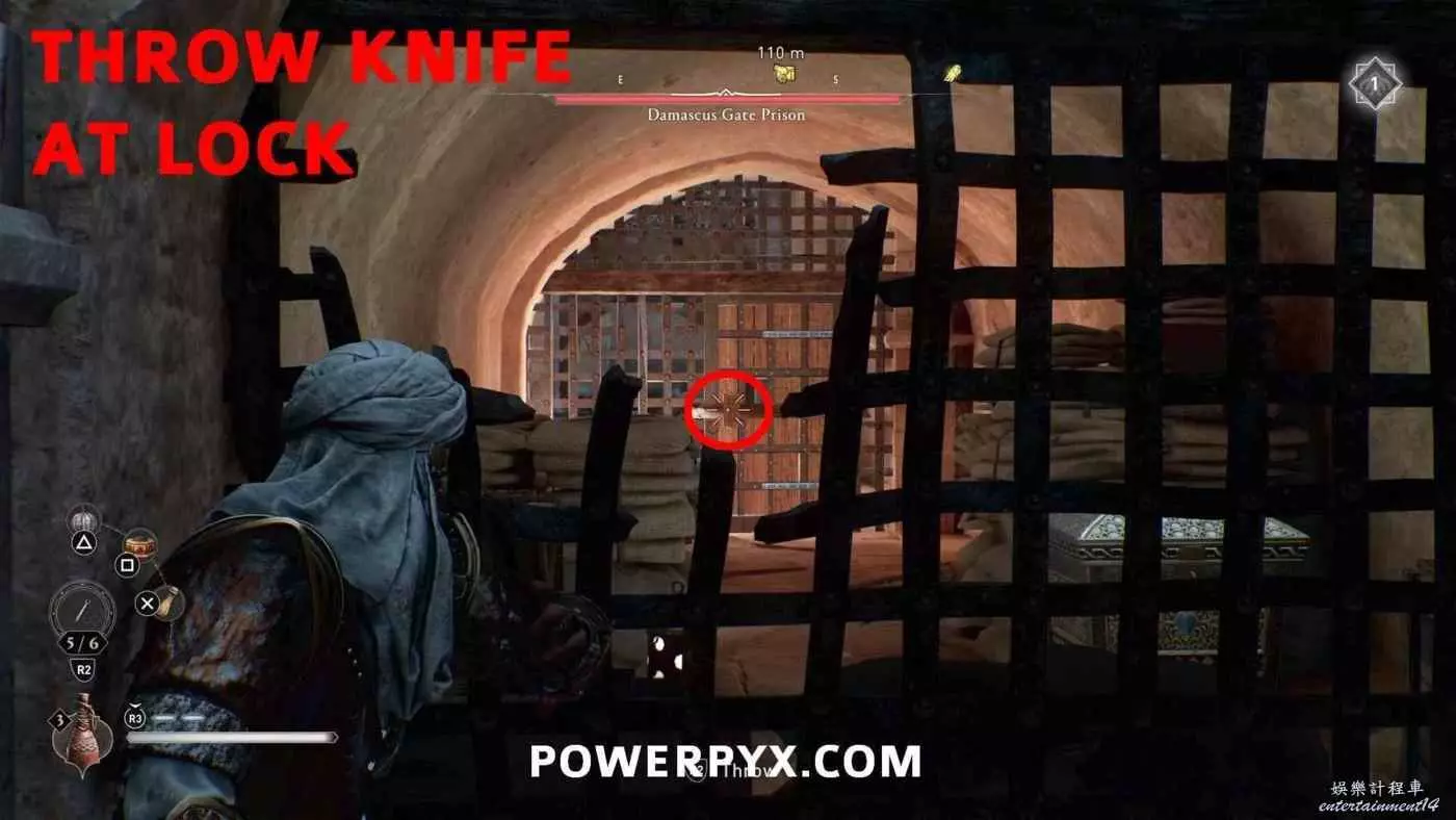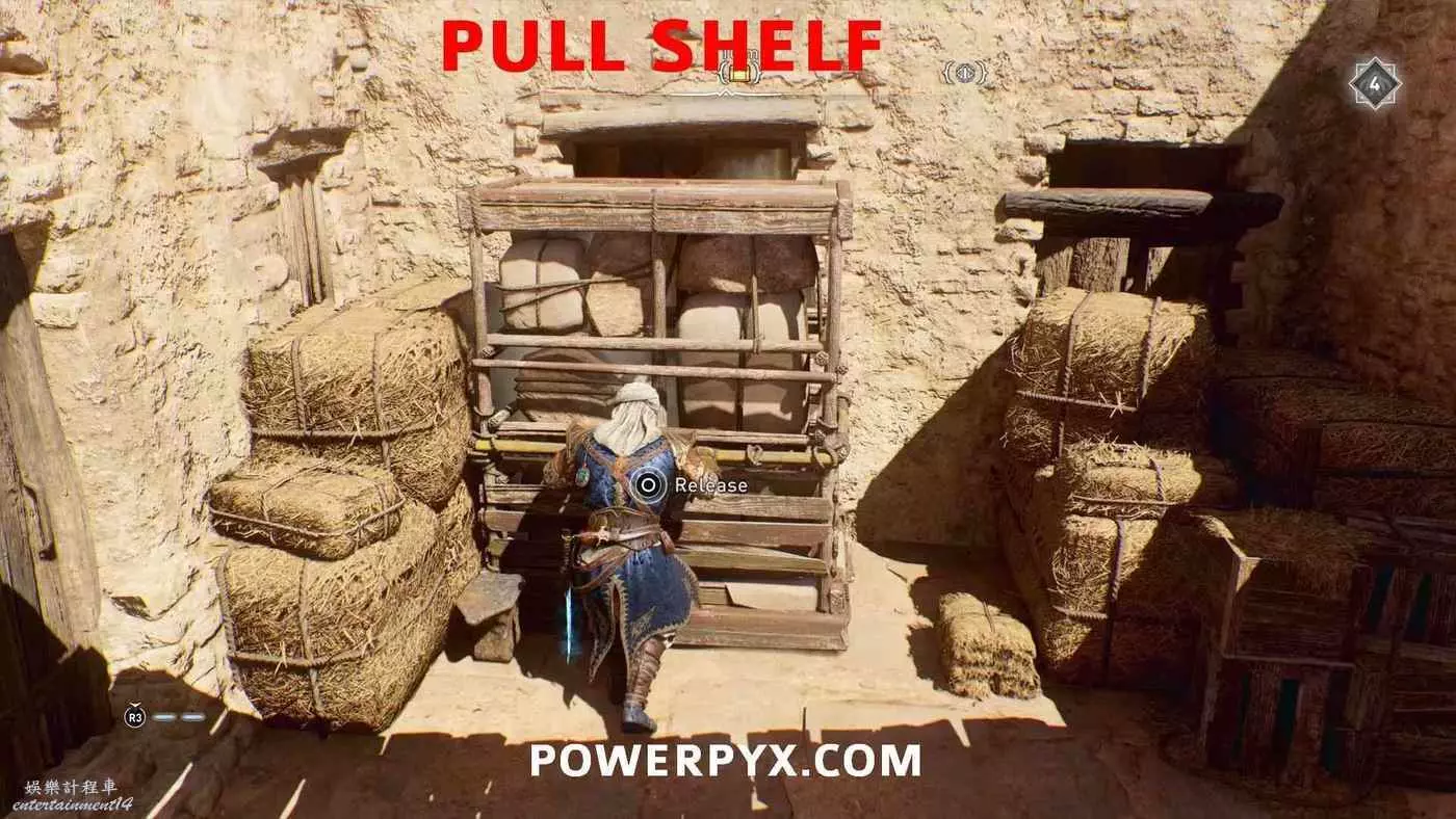 門外右側角落有幾個花瓶,用近戰攻擊打碎它們,花瓶後面的兩個架子可以推開,將左側架子往前推,右側架子原地不動,然後從兩個架子之間的開口處瞄準另一個花瓶,用飛刀打碎它。