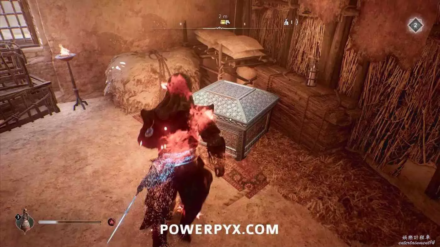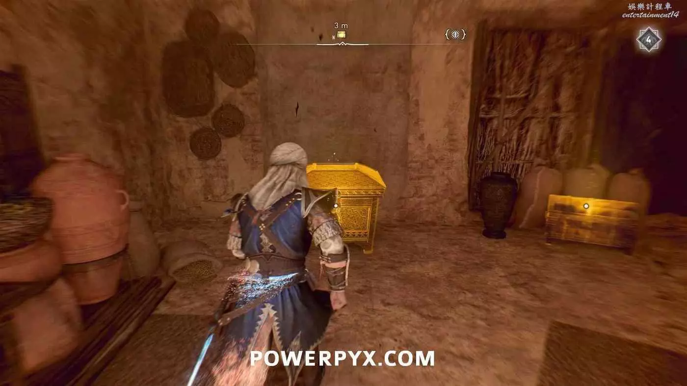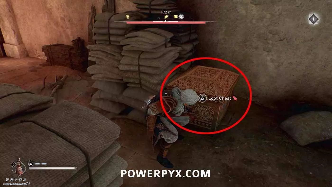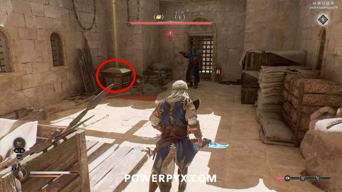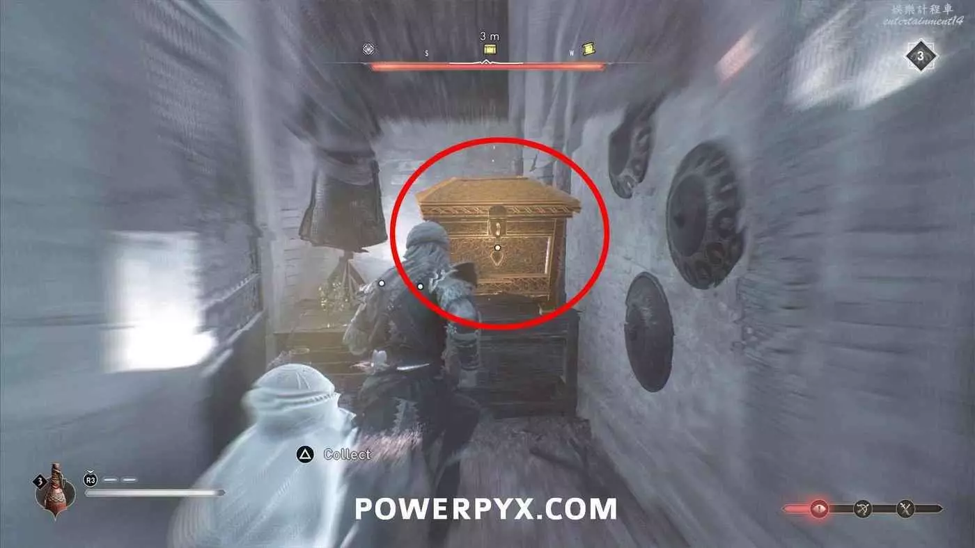 此裝備箱在下層一個上鎖的房間裡,通往箱子所在房間的門在東側,門是鎖著的,需要用飛刀打碎門鎖。從箱子西側走穿過門洞,用飛刀擊中門背後的鎖即可。