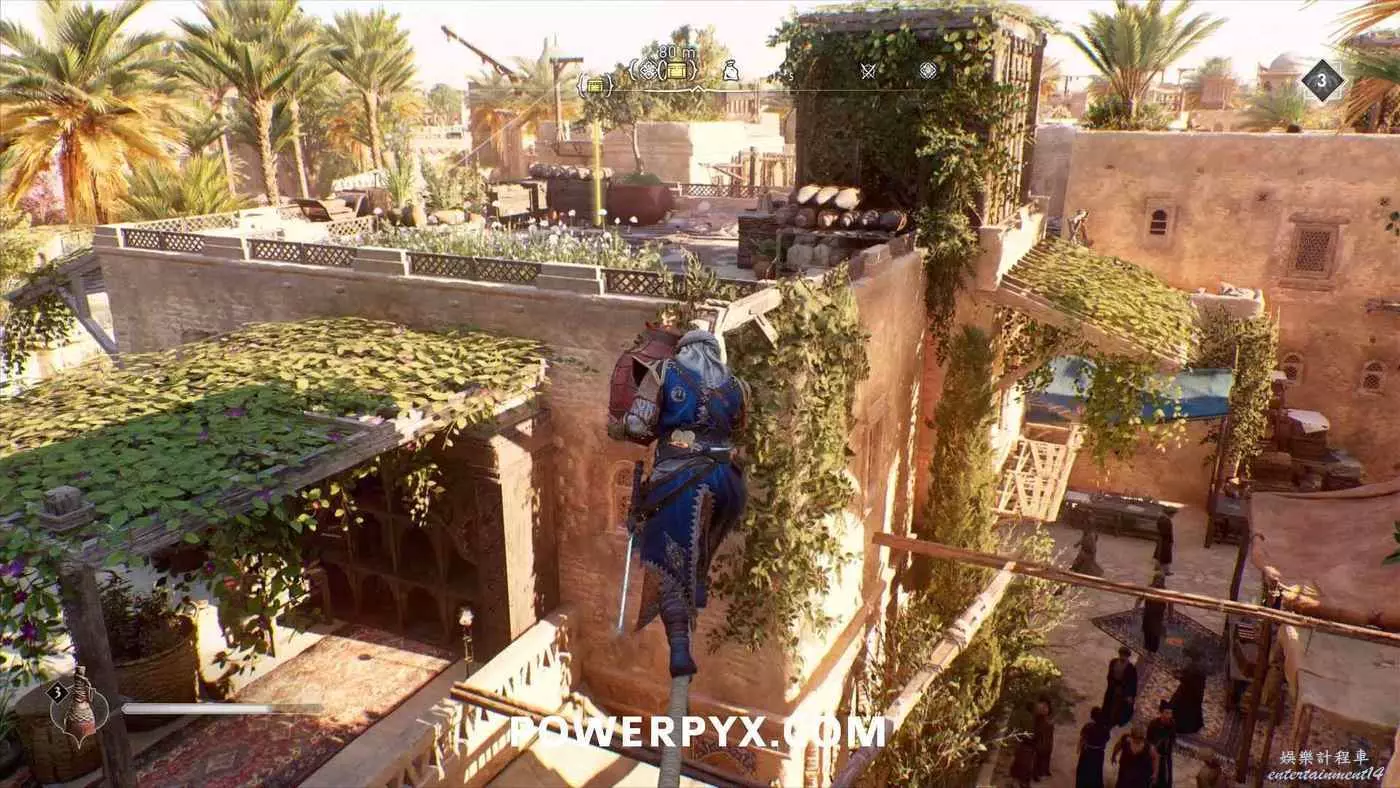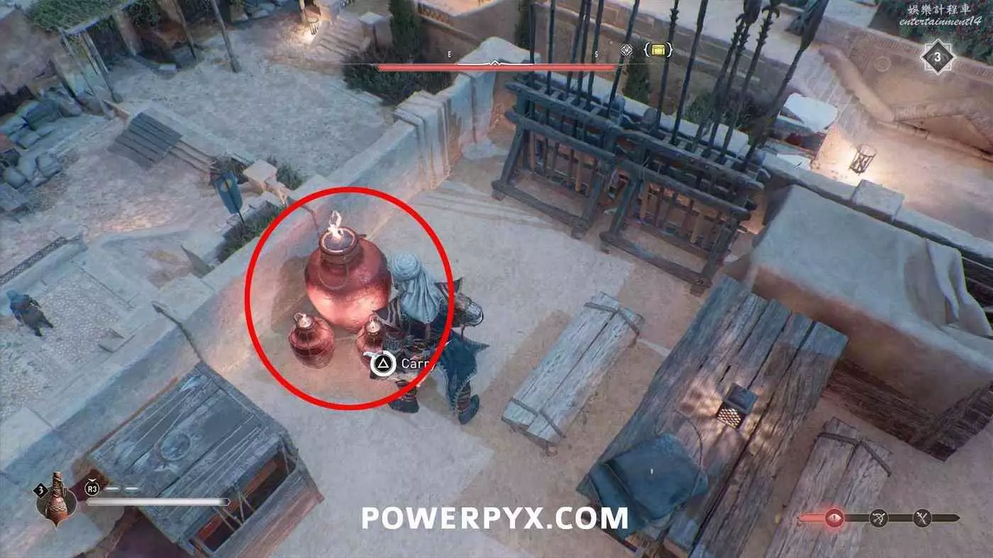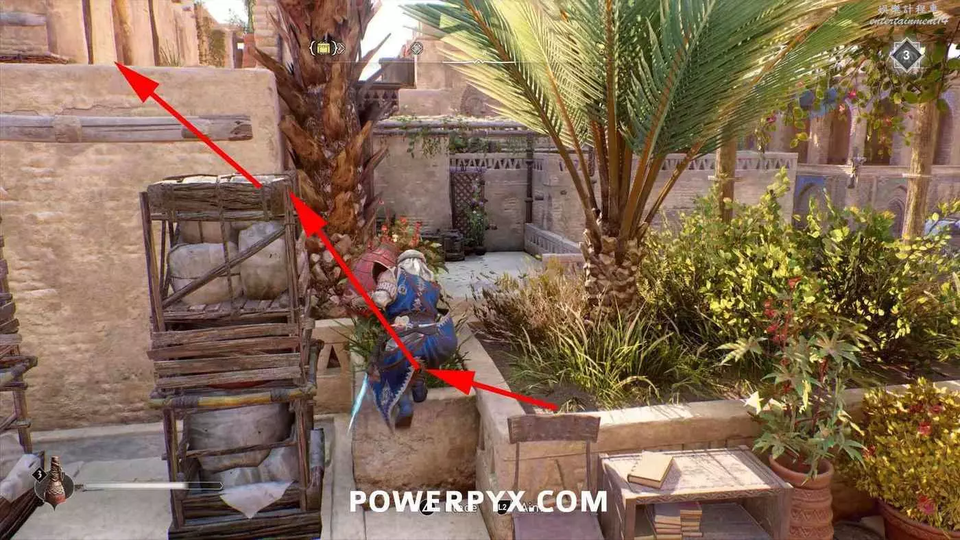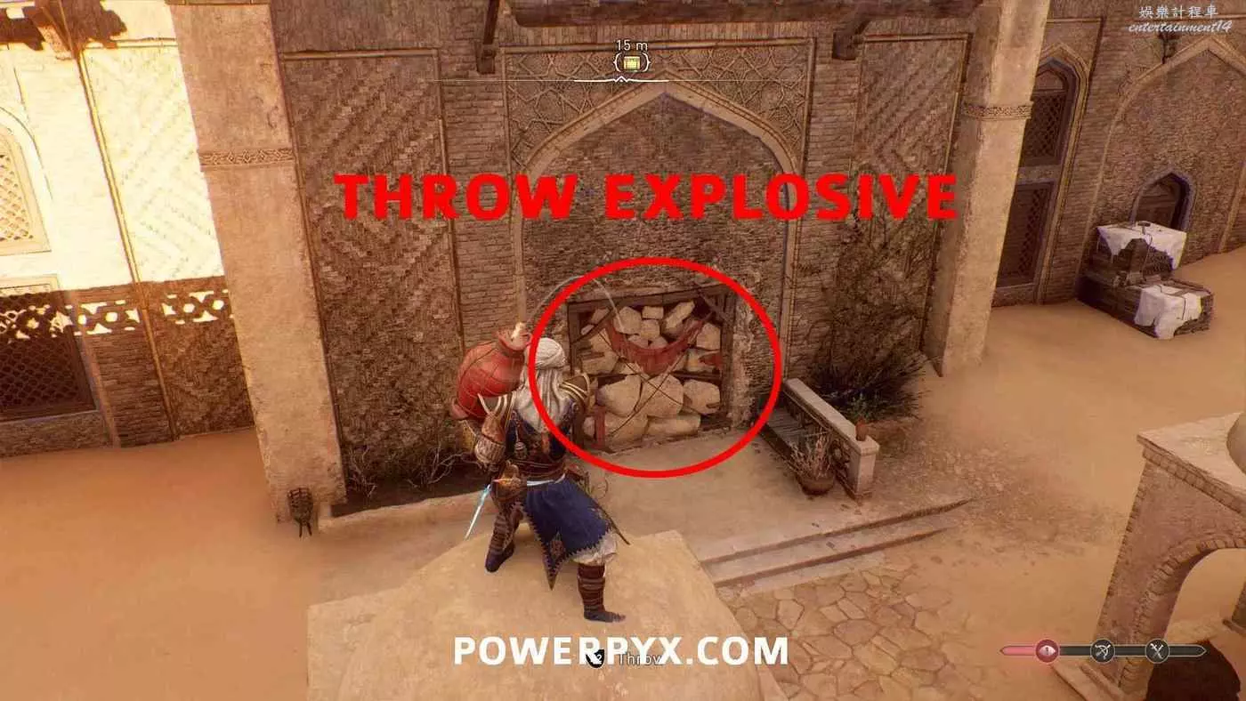 從東邊的正門進入,院子右側有個可移動的架子,跳到繩子上,拾取炸藥桶前往露臺。