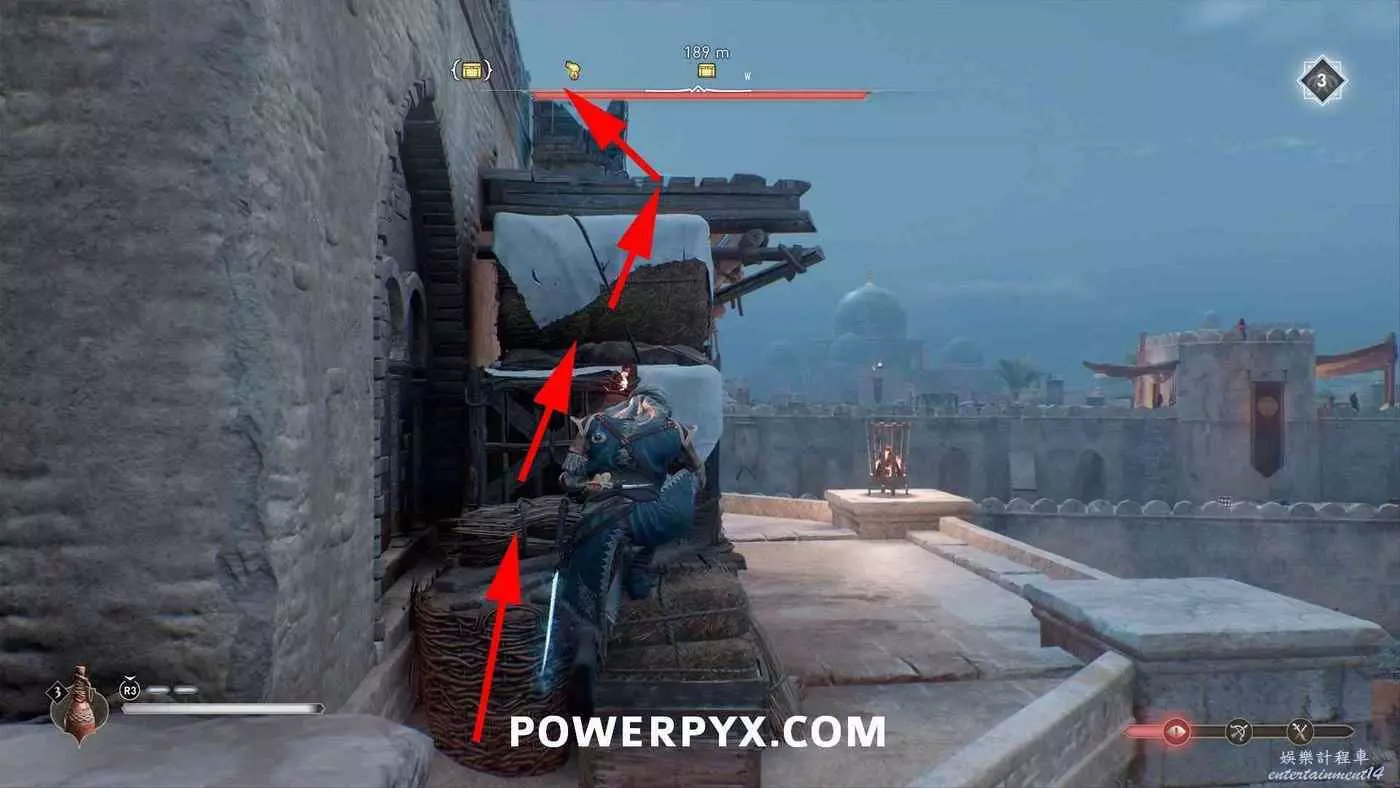 塔樓後方有兩個紅色炸藥桶,撿起一個跳上牆邊的箱子,然後把炸藥桶帶到屋頂。