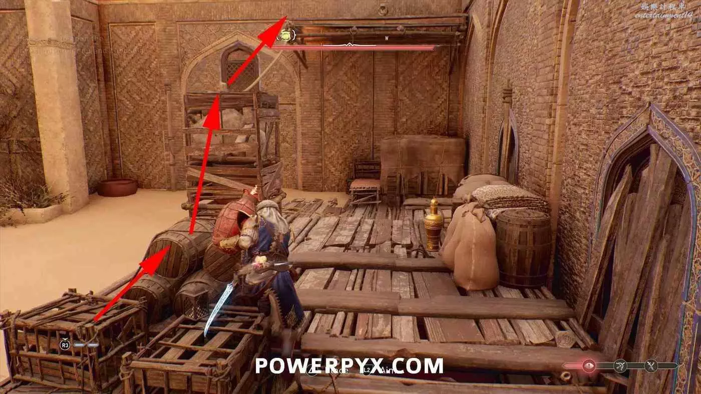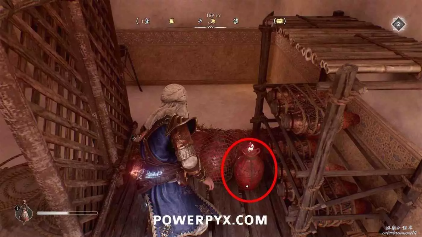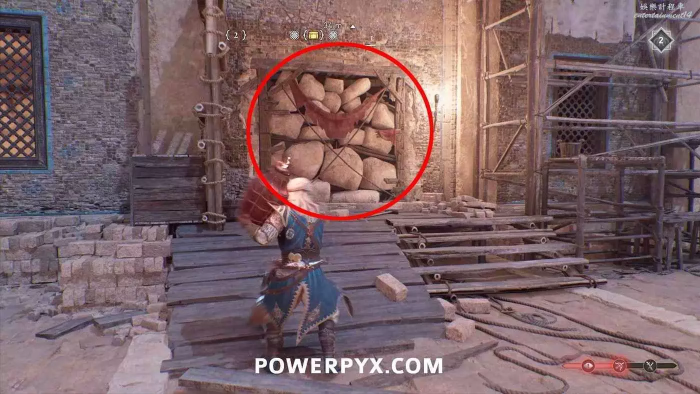 沿著牆壁上的木棍往下跳,將炸藥桶扔到建築背面可破壞的牆壁上即可找到裝備箱。