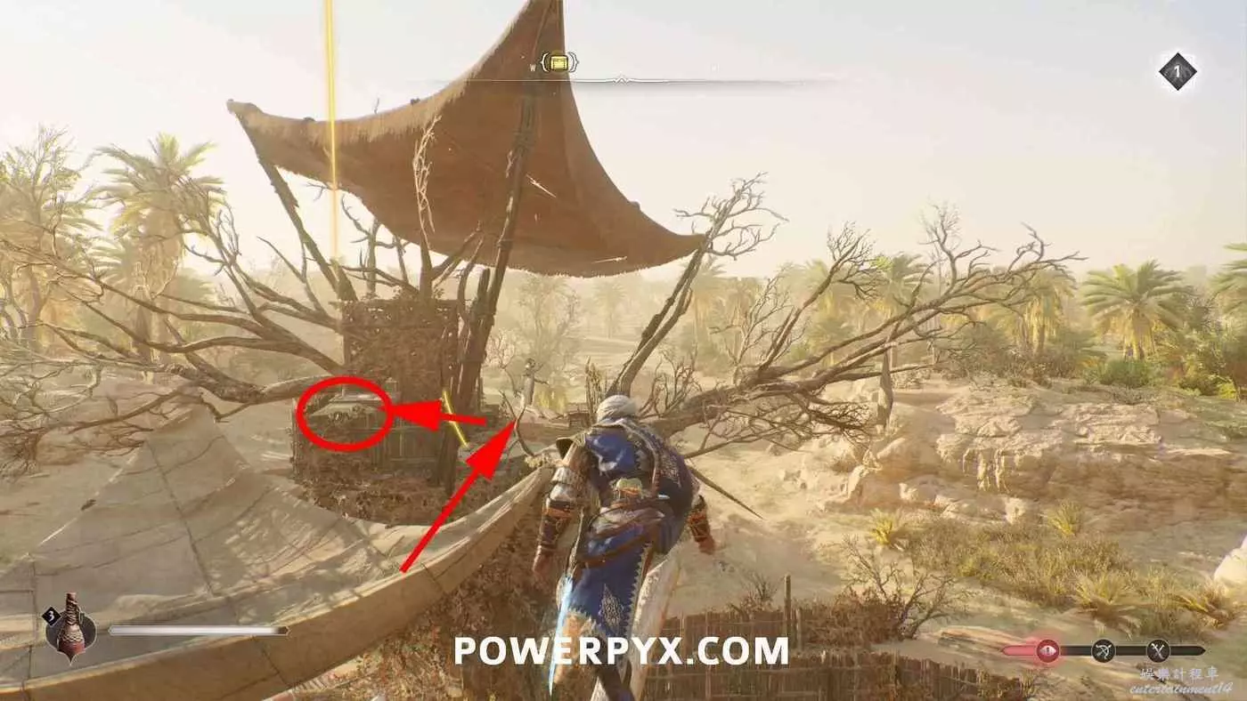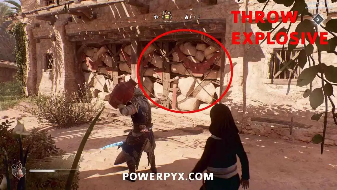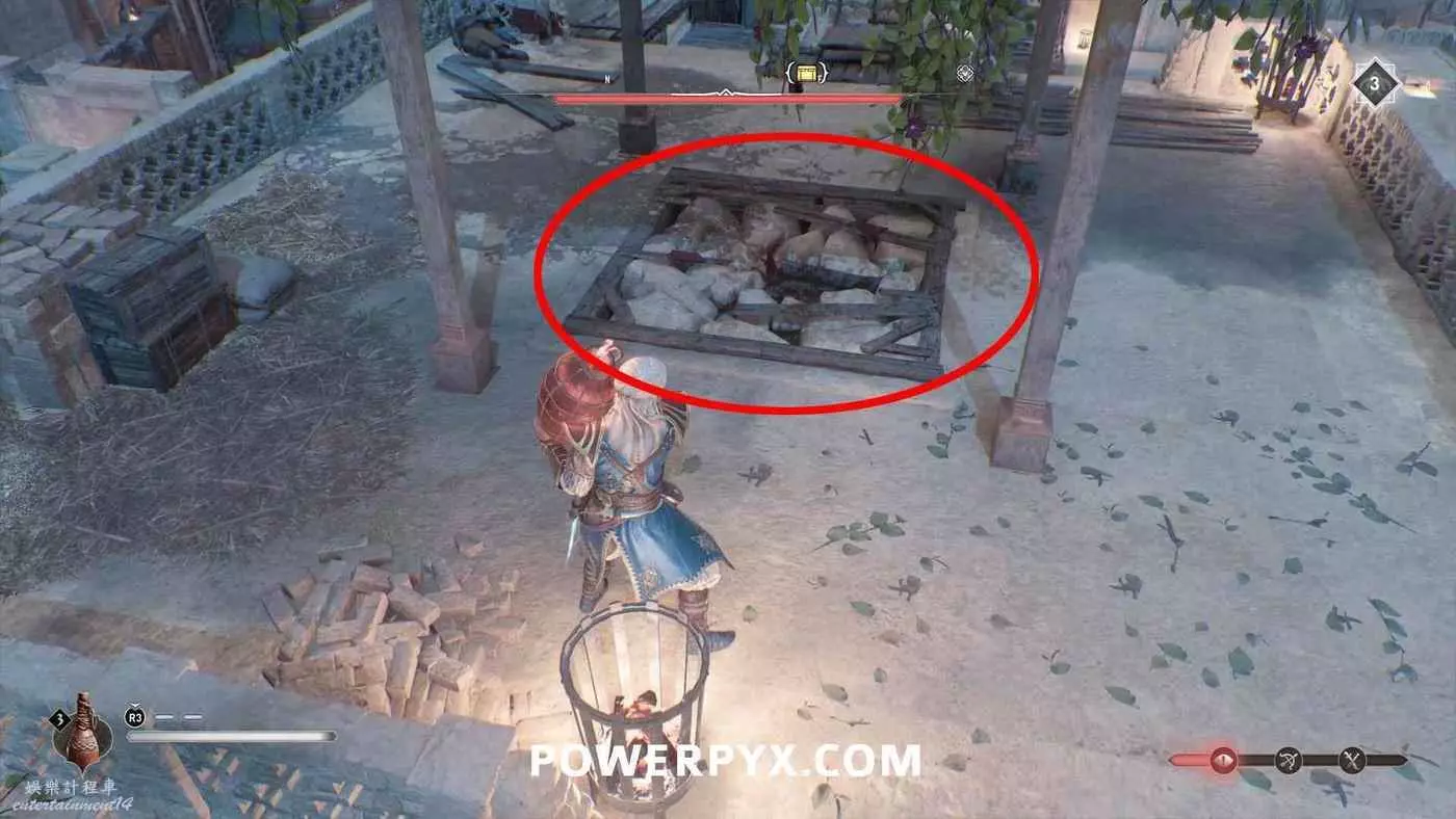 沿著牆壁上的木棍往下跳,將炸藥桶扔到建築背面可破壞的牆壁上即可找到裝備箱。