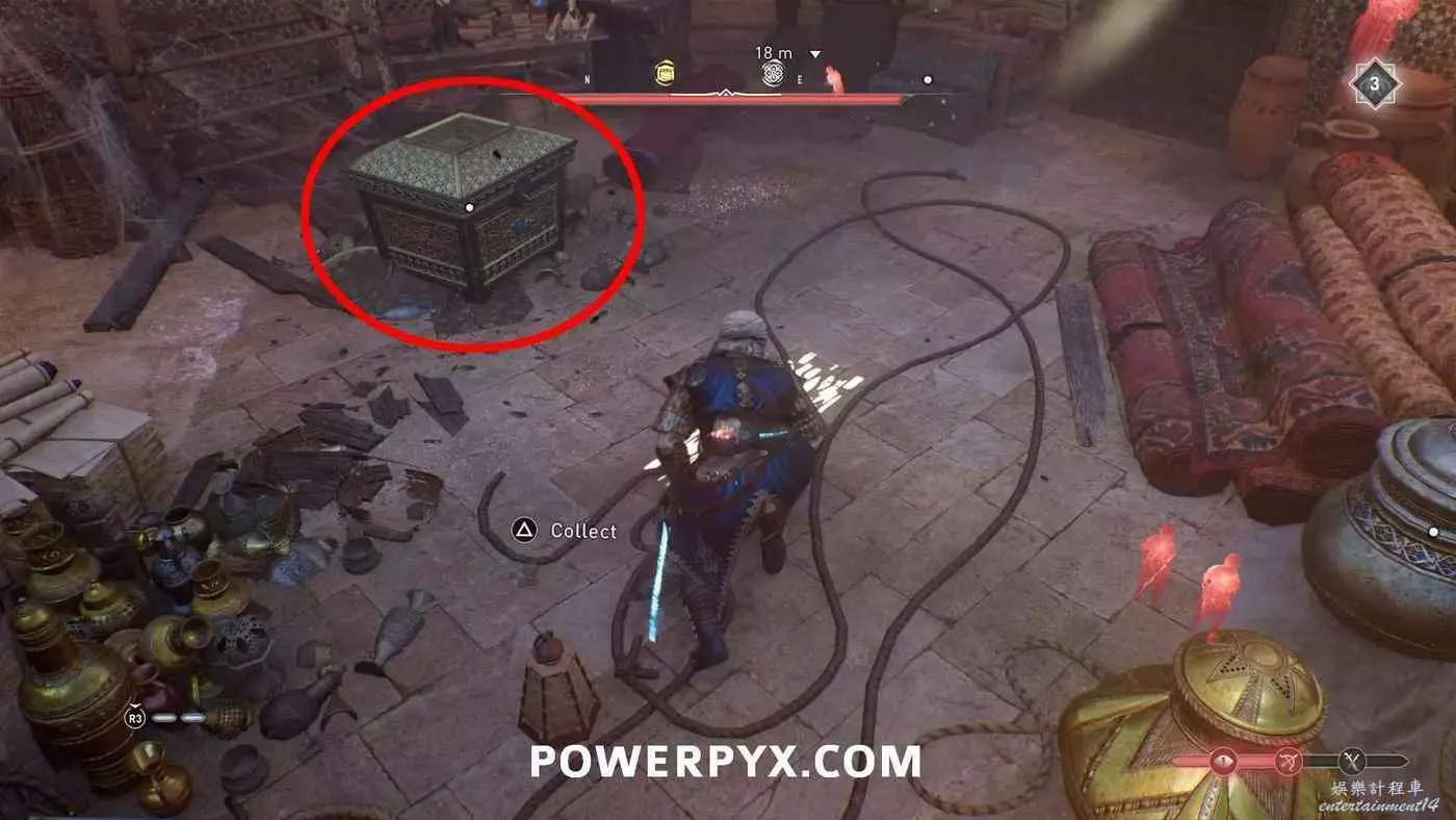 打碎花瓶後,將右側架子往前推,再打碎一組花瓶,從開口處進去即可找到裝備箱。
