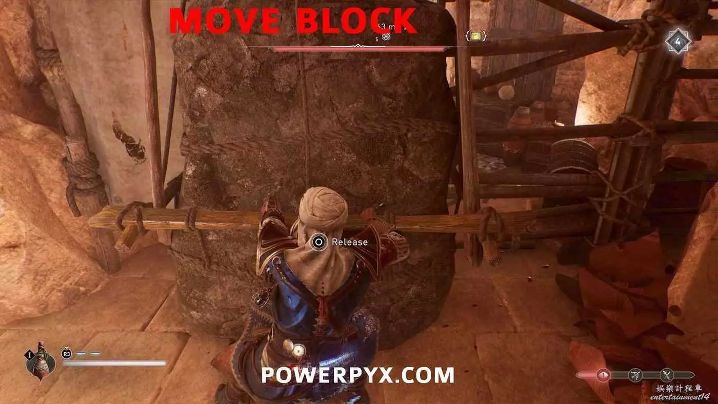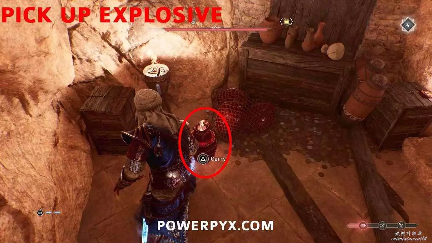 左側有一塊可移動的岩石,打碎旁邊罐子,把岩石推到右側。撿起架子後面的紅色炸藥桶。