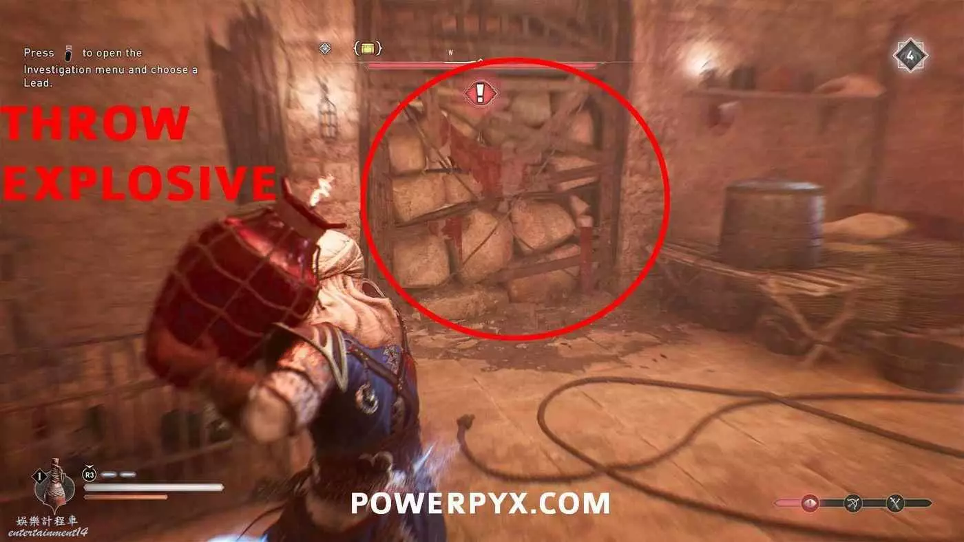 在下個房間把炸藥桶扔到可破壞的牆上。