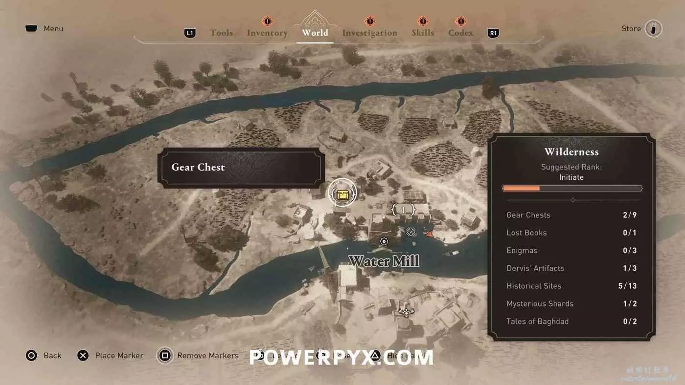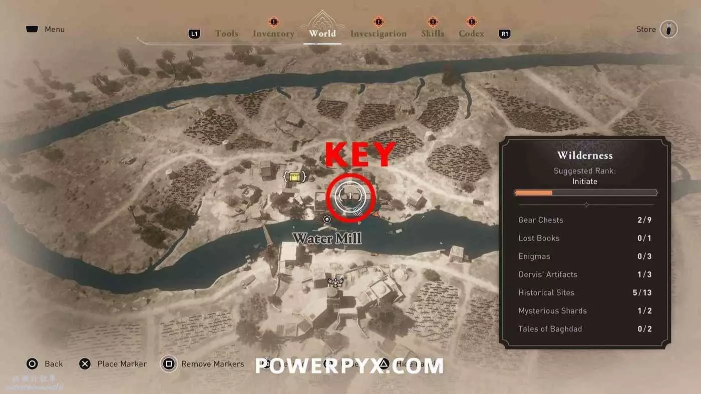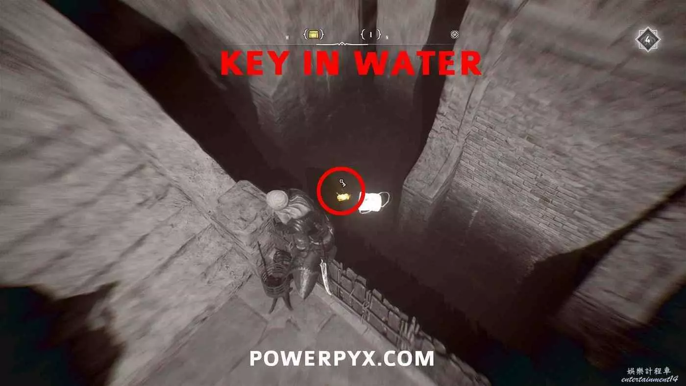 首先需要找到鑰匙來打開箱子。鑰匙的位置在地圖上裝備箱圖示東南邊幾米處的水下,靠近水車(參考下圖所示位置),跳入水中潛水,掃描會以白色高亮顯示,遊到水底拾取【水磨坊箱子鑰匙】。